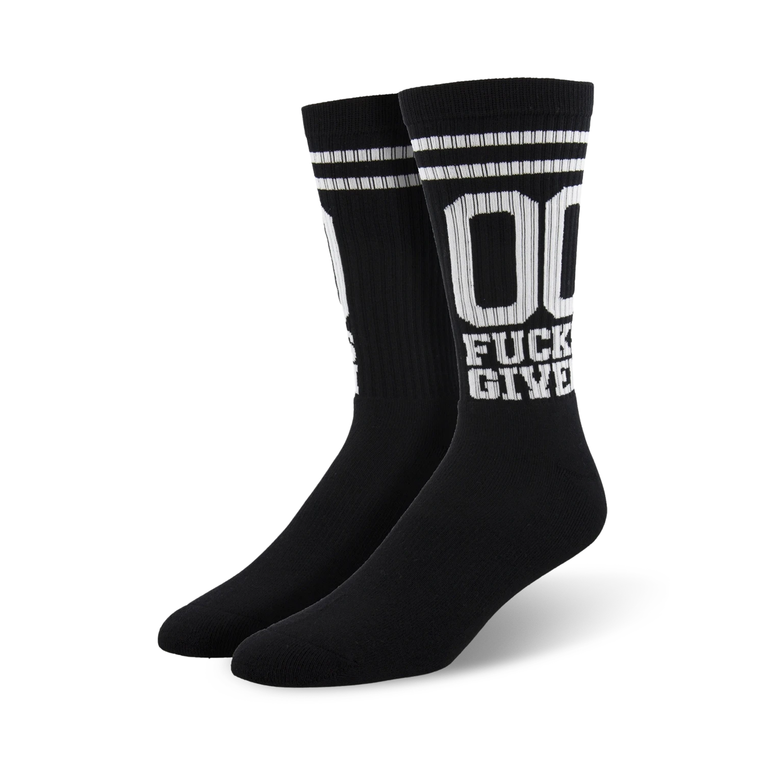 These 00 Fucks Given black athletic gym socks are perfect for those days when you just can’t be bothered to care about your workout or about the malaise of life in general. Maybe you’re feeling a little burnt out, or maybe you’re just not in the mood. Either way, these socks will let everyone know that you’re not here to mess around.
