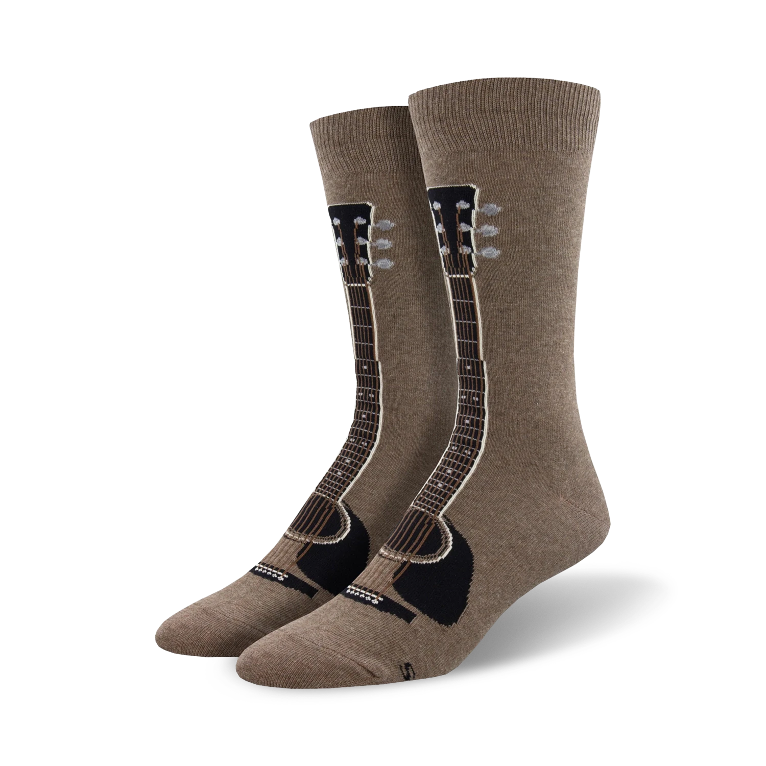 Lace up, rock out, and shred in these 6 String socks! Electrify your feet with funky black acoustic guitars with crisp white details on a brown crew length sock. These guitar themed socks are sure to strum up compliments and make you the star of any band. Solos sold separately.