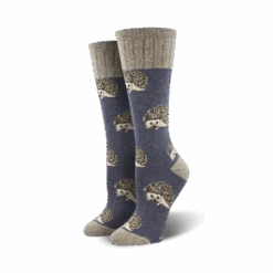 These A Bit On Hedge Wool crew socks for men and women feature cute cartoon hedgehogs with white bellies and brown quills on a dark olive green background. Hedgehogs are known for their prickly quills, but these socks are made with a soft, cozy blend that’s anything but prickly. They’re easy to wear and keep your feet comfy all day long.
