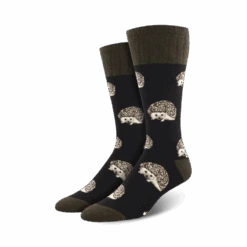 These A Bit On Hedge Wool crew socks for men and women feature cute cartoon hedgehogs with white bellies and brown quills on a dark olive green background. Hedgehogs are known for their prickly quills, but these socks are made with a soft, cozy blend that’s anything but prickly. They’re easy to wear and keep your feet comfy all day long.