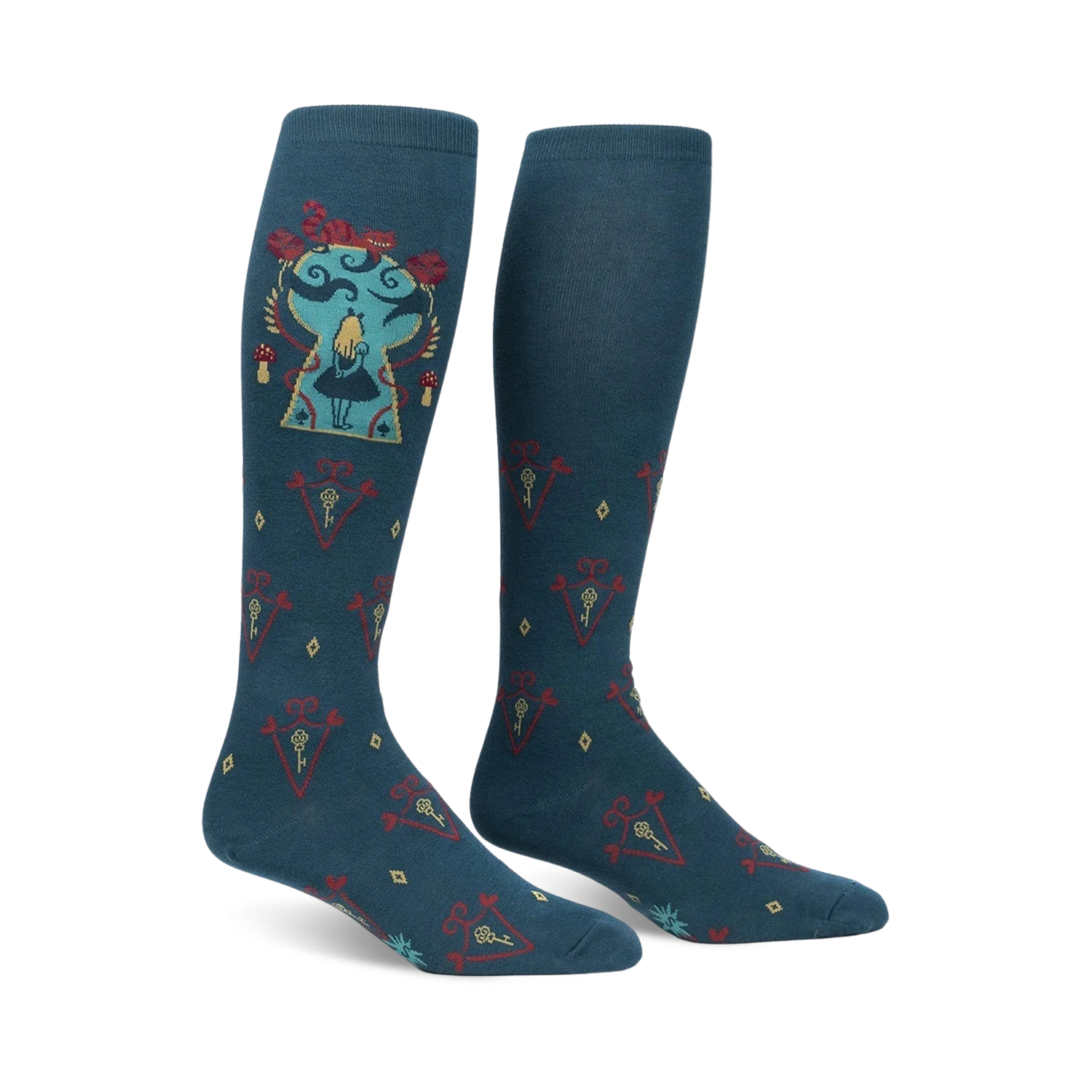 Fall down the rabbit hole with our Alice in Wonderland knee socks! Featuring a vibrant pattern of gold keys and diamonds on a dark teal backdrop, these socks are as captivating as a Cheshire cat’s grin. Each sock boasts a regal portrait of Alice, inviting you to explore the fantastical world of Wonderland. Prepare to have grinning feet!