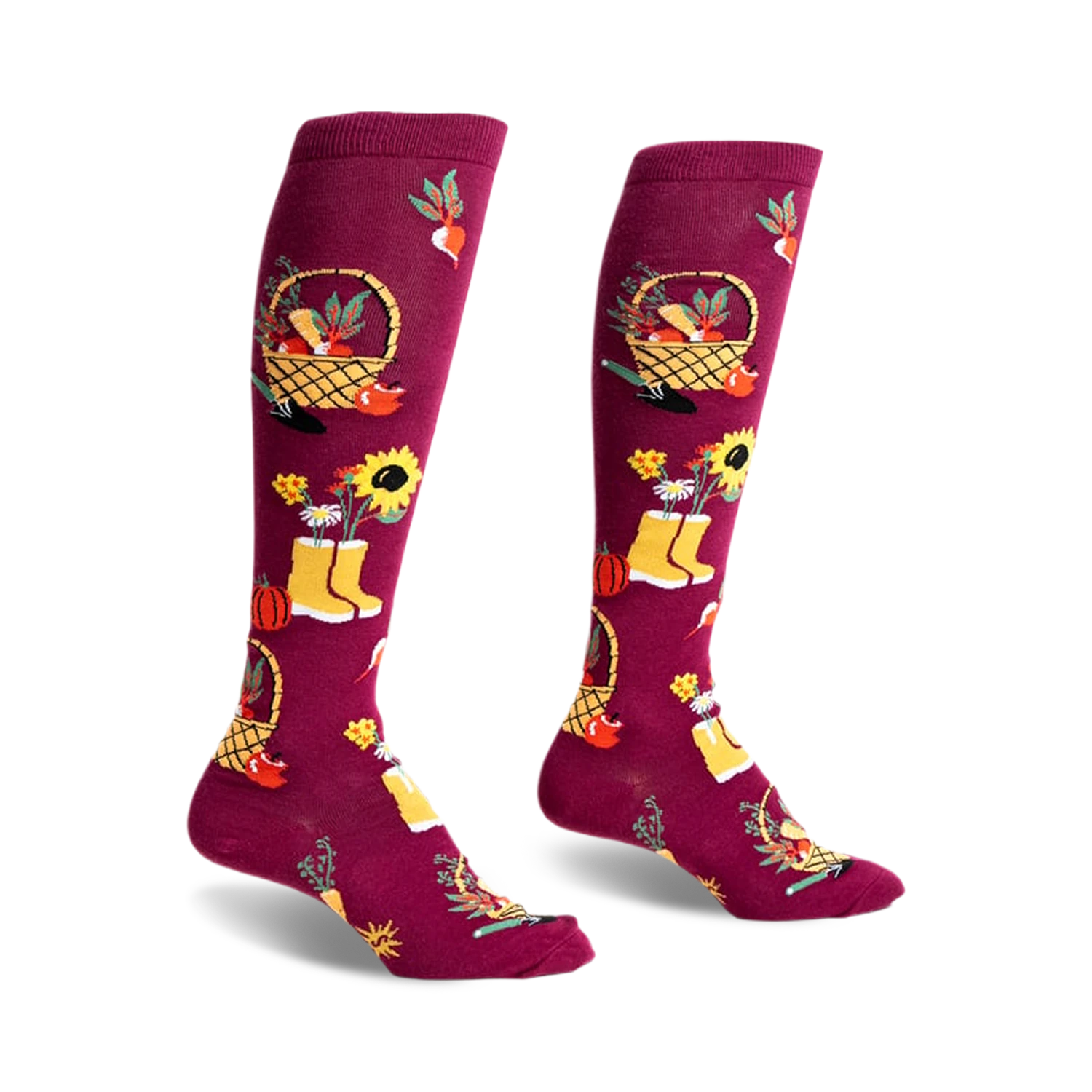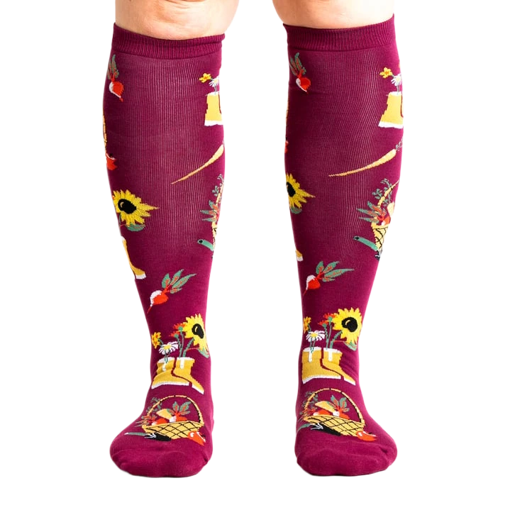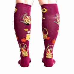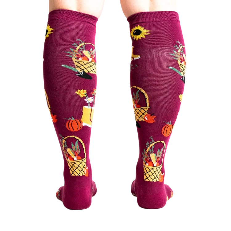 There’s something magical about the autumn harvest, where vibrant colors and bountiful yields inspire creativity and warmth. Capture that essence with our knee-high socks, perfect for fall gardeners and anyone looking to add a dash of seasonal charm to their wardrobe. These burgundy socks, adorned with a lively garden motif featuring baskets of fruit, potted flowers, and cheerful yellow rain boots, are sure to brighten your day and squash the monotony of plain socks. Embrace the playful spirit of fall and let your feet enjoy a little garden party.