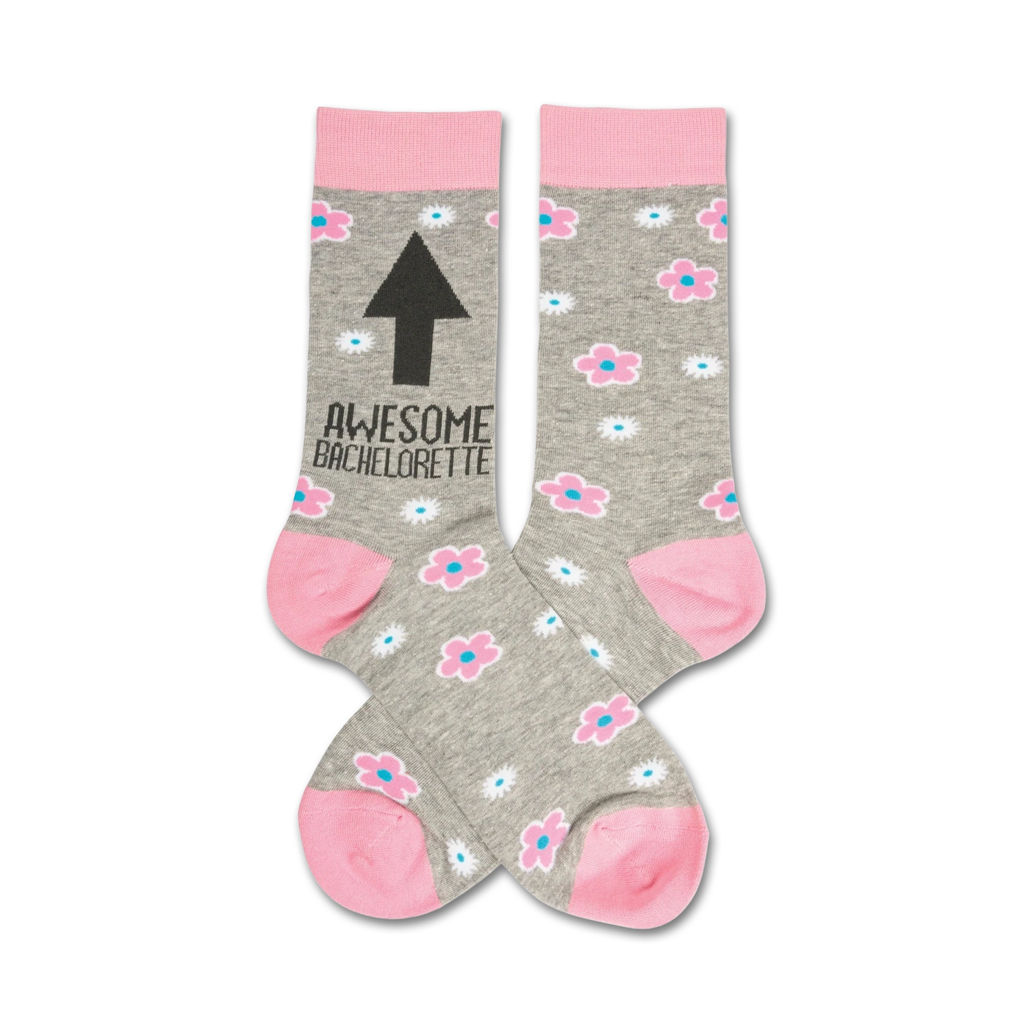 Decked out in sophisticated grey with a pop of pink, they play the subtle star of any bachelorette bash. Who needs a wild night out when you can make a statement lounging in? With an upward-pointing arrow, these socks hint at the only way your spirits are headed β sky-high, just like your plans. And donβt miss the floral garnish, because every good celebration deserves its own bouquet. Perfect for the gal whose party vibe is more “chill in style” than “dance ’til dawn.”