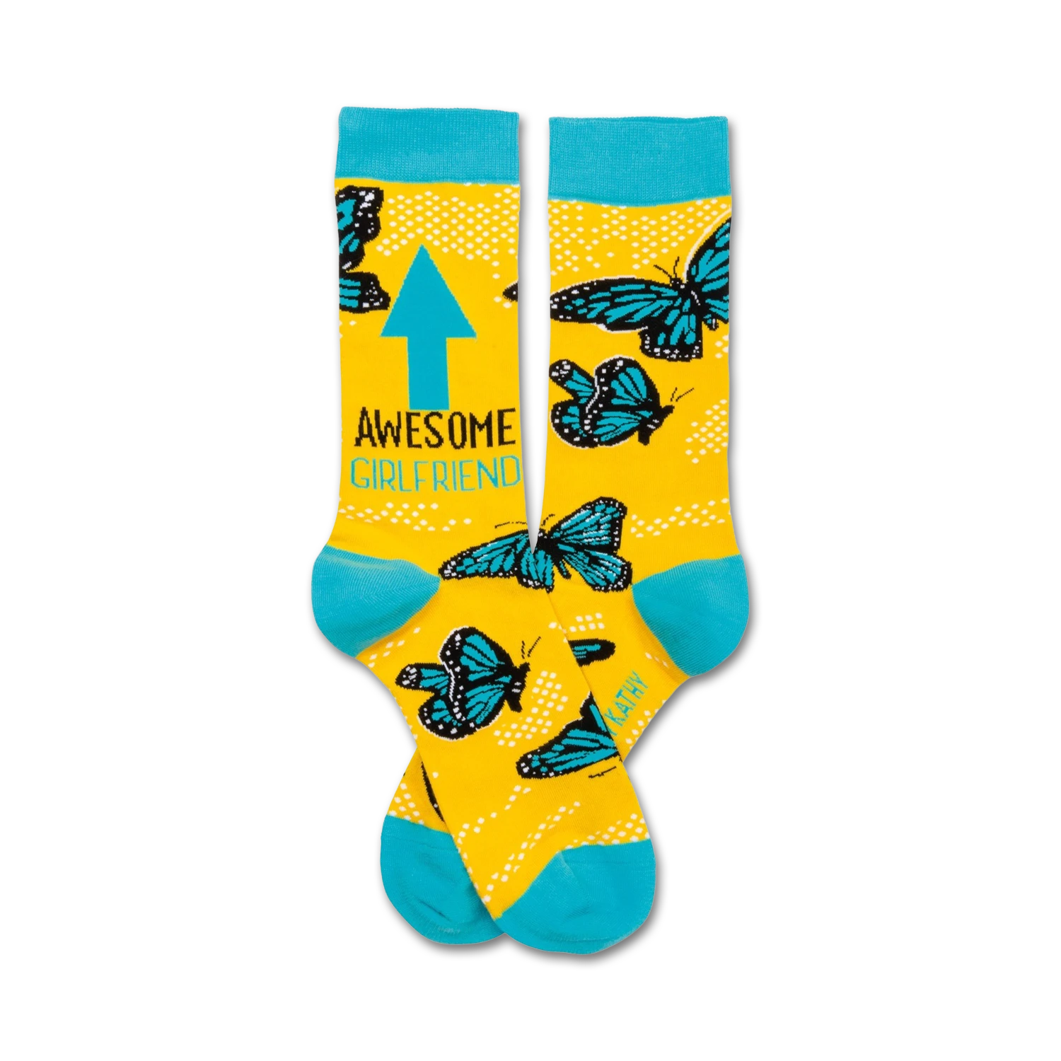 Get ready to strut your stuff in these “Awesome Girlfriend” socks that shout (but not too loudly) about your awesomeness. These aren’t just any crew socks; they’re a vibrant splash of yellow with bold blue accents at the toes, heels, and cuffs—because why should shoes have all the fun? Decorated with whimsical butterflies and playful polka dots, these socks are like a mini party for your feet. And yes, there’s an arrow pointing up, subtly hinting that the cool factor is off the charts up here. Whether you’re kicking back or kicking butt, these socks ensure your feet are wrapped in a statement as fun and fantastic as you are. No need for clichés, your feet are about to be legendary.