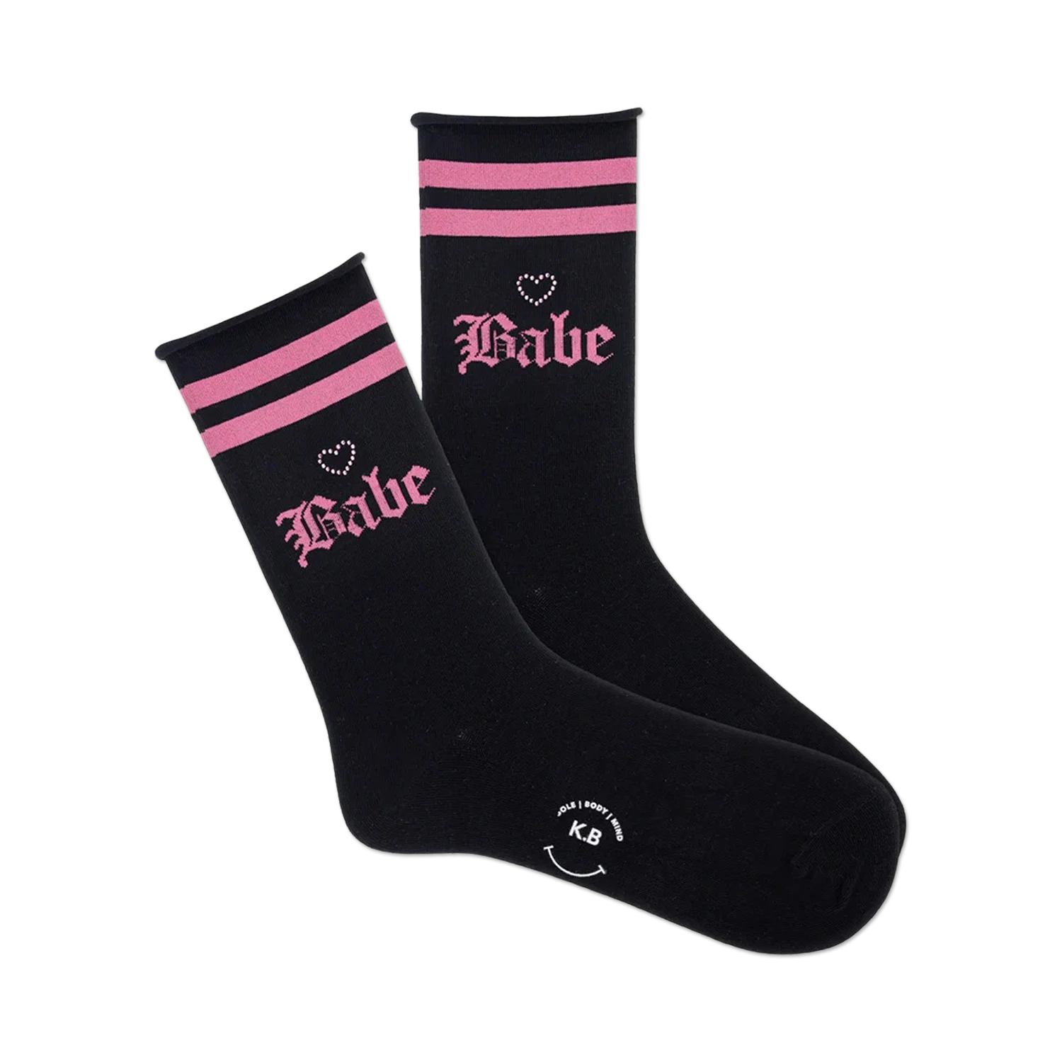 Strut your stuff with our “Babe Roll Top” socks. Express your sassy side with these black and pink, crew length, statement socks. Join the club of cool cats who rock their sassy style with a touch of fun. Ready to add more pep to your step? These socks are just the ticket!