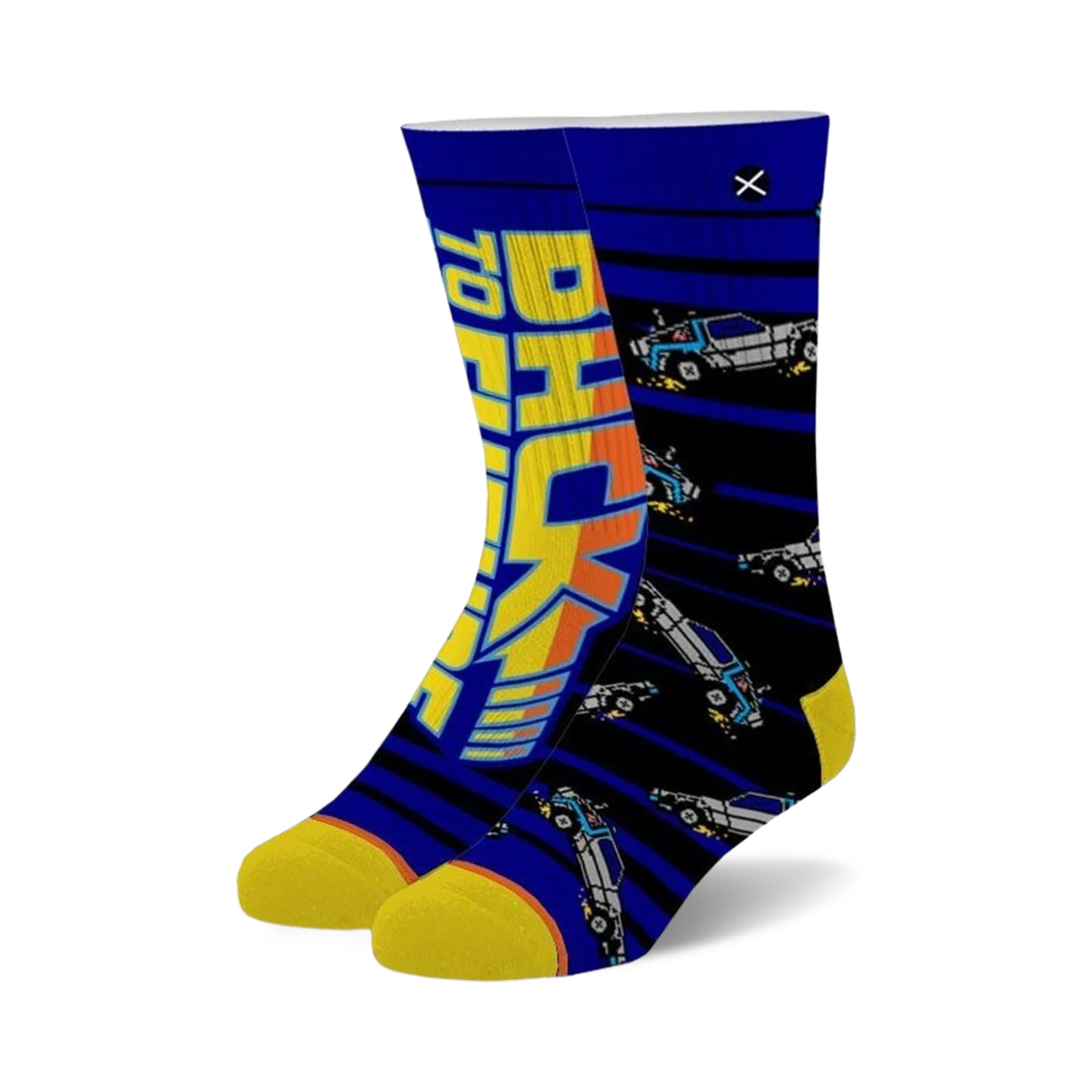 Blast back to the 80s with Marty McFly on these tub-ular crew socks! Guaranteed not to leave you hanging, these bad boys feature a sleek blue design with yellow stripes, toes, and heels, as well as a sweet set of wheels. The perfect addition to any fan’s collection.