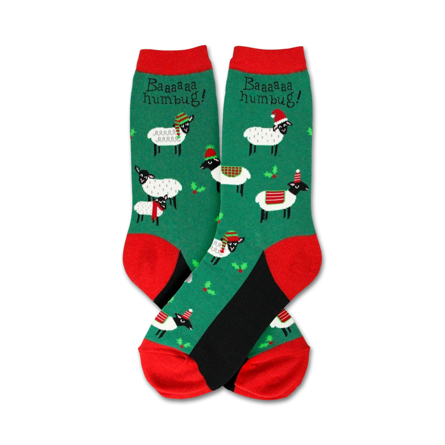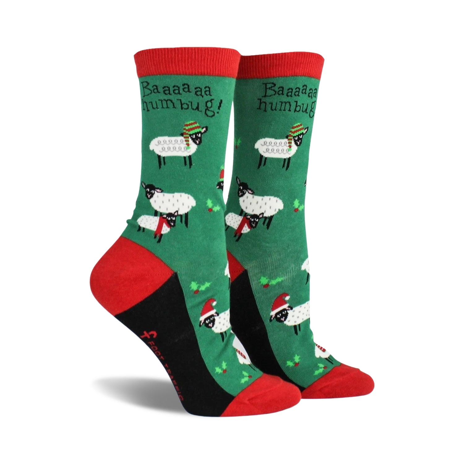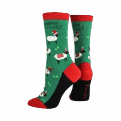 Step into the holiday season with a wink! These green crew socks for women feature an assembly of white sheep, each stylishly sporting a red Santa hat, and make a playful jab at festive norms with “Baaa…Humbug!” stitched boldly across them. With red cuffs, black heels, and toes, these socks are a quirky accessory for anyone who enjoys their holiday festivities with a dash of rebellious spirit. Perfect for the woman who loves to mix a little fun with her fashion.