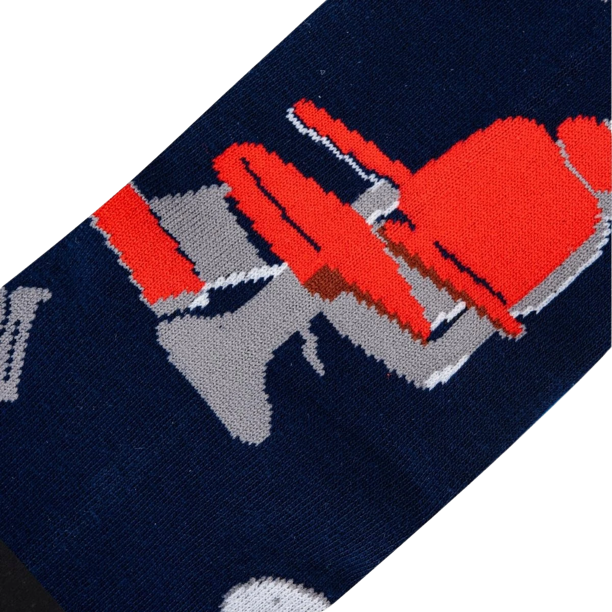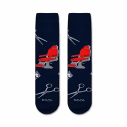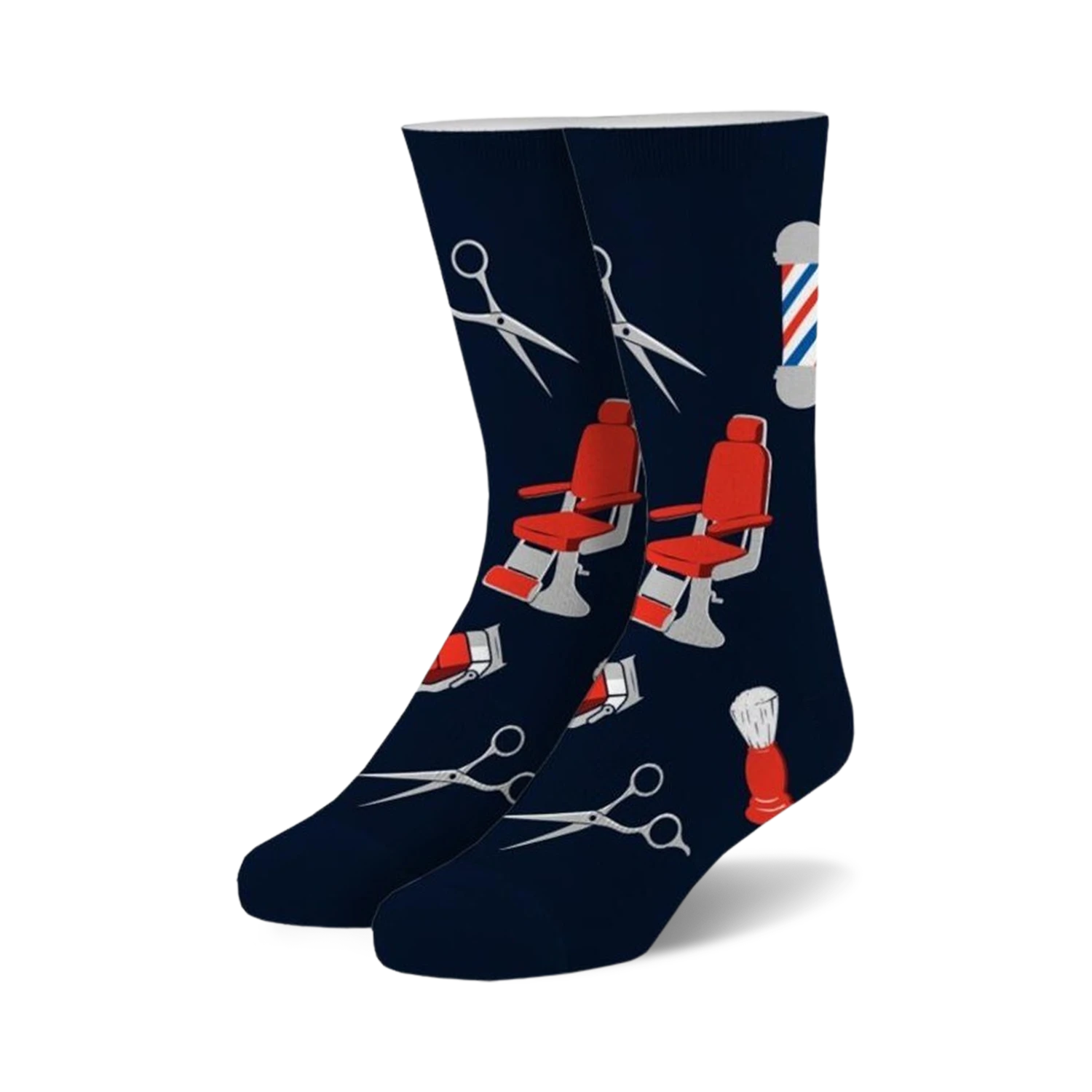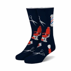 Get ready to turn your feet into fabulous with our wickedly fun Barber Shop socks! Picture this: A marvelous pattern of shiny silver scissors, mesmerizing red barber chairs, and razor-sharp silver shaving brushes, all waltzing around on your feet against a dark blue backdrop. These socks will have you snipping, clipping, and shaving your way through your day with a smile. For men and women, these crew-length showstoppers prove that even a simple trip to the barber can be oh-so-stylish.