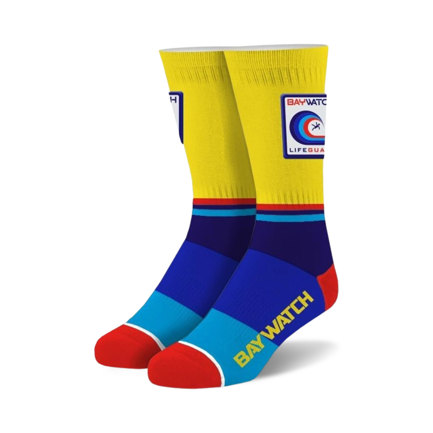 Step into the iconic world of Baywatch with these fun and vibrant socks. A touch of retro fun for fans of the iconic 90’s TV show, with the easily recognizable stripe, toe design, lifeguard patch and bold embroidered logo. A perfect way to add a splash of color to your everyday wardrobe and show off your love for the beach.