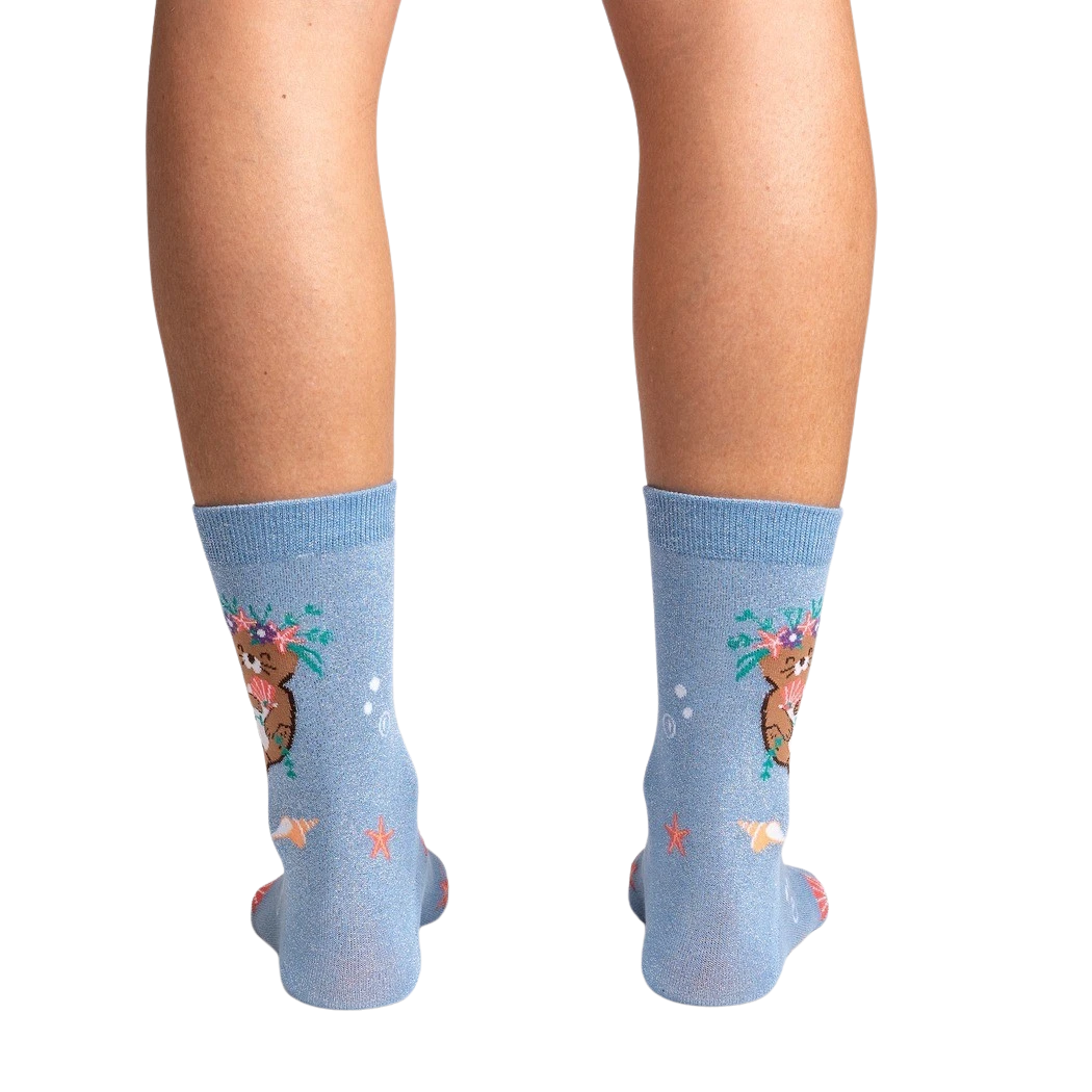 Unleash your otter personality with these whimsical crew socks! Say a-otter-able while rocking these socks adorned with cartoon sea otters sporting flower crowns and clutching pink and orange starfish. Like a mermaid that got lost on land, these socks add a pop of color to your shoe game. With seashells scattered throughout, you’ll be shining brighter than a sunbeam bouncing off the ocean. So, dive in and let your inner otter shine!