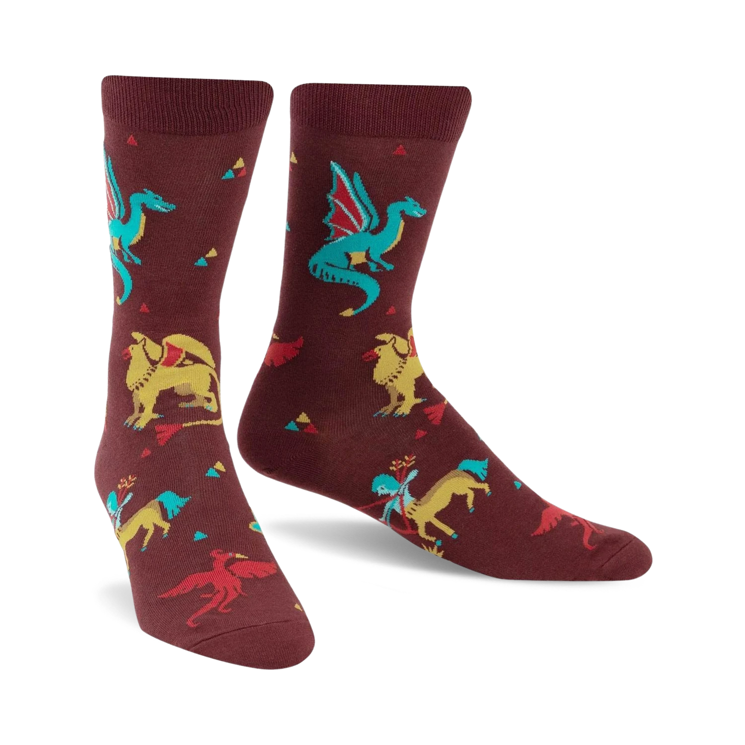 Beasts of Yore socks will transport you to a magical realm where dragons, griffins, and unicorns roam free. These mythical creatures in vibrant hues dance across a backdrop of geometric shapes, making these socks a whimsical fashion statement. Experience a touch of fantasy with every step!