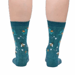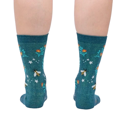 Meet Bee Dazzling Shimmer socks! Picture a dark teal canvas buzzing with a flurry of yellow and black striped bees gathering nectar from orange, pink, and white flowers under a crescent moonlit sky filled with twinkling stars. These crew length socks for women have a ribbed top and fortified toe and heel. Like a bee’s resilience, these socks will last and dazzle!