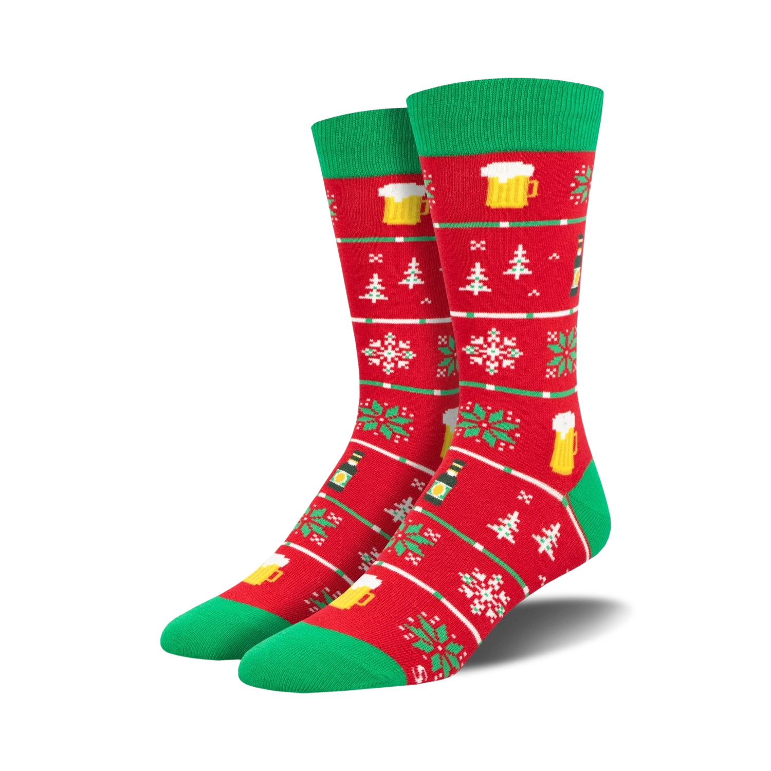 Red Beer Sweater Crew Socks for Men! Got a hankerin’ for Christmas cheer and a cold one? Beer Sweater socks are the knee-high answer! Pull on these bad boys to feel like you’re sitting next to a roaring fire, nestled in a cozy log cabin sipping your favorite brew while snow softly falls outside. Soft, warm and ready to keep your toes feeling festive, these socks are the perfect stocking stuffer for the holiday beer lover in your life.