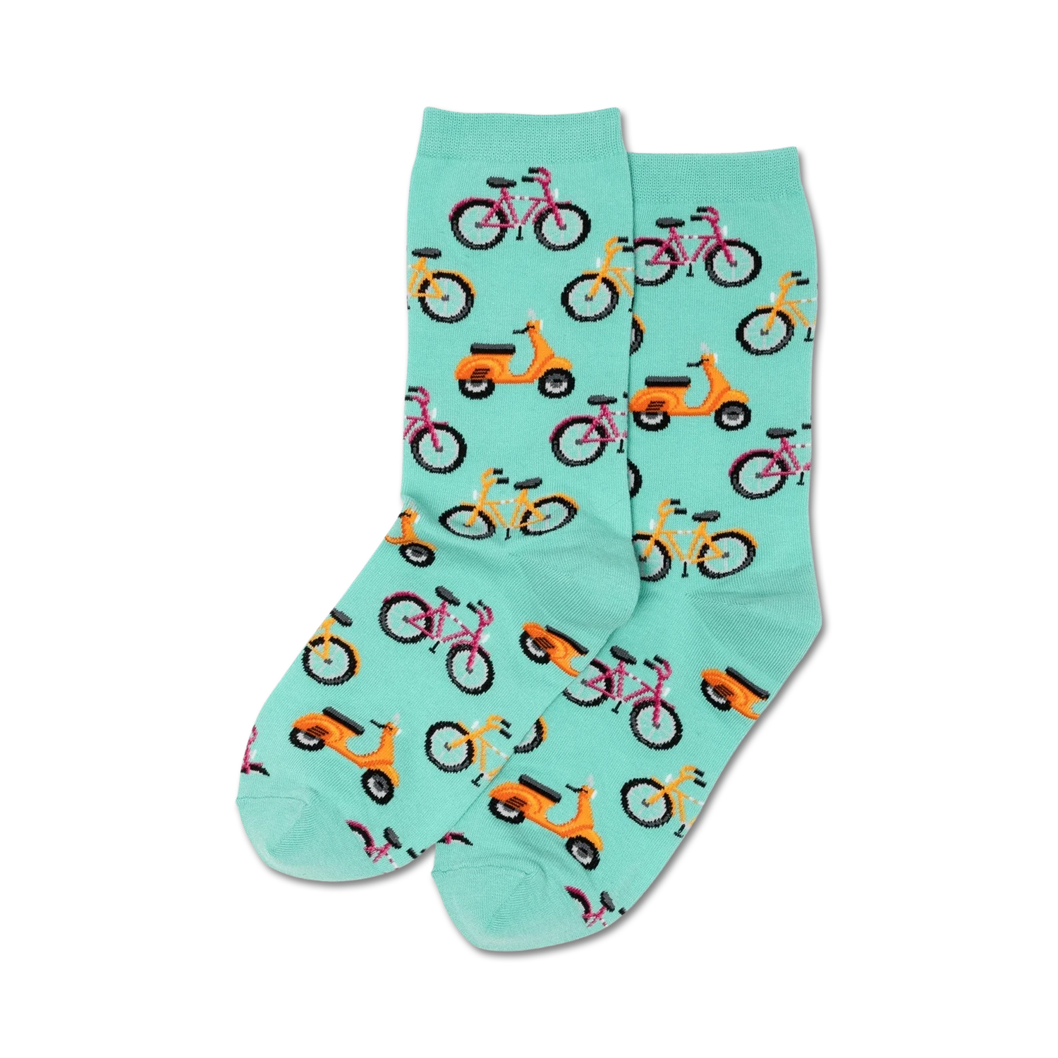 Two-wheeling through life in style with our Bike and Vespa Crew Socks for women! These socks have a pattern of orange and pink bicycles and yellow scooters on a cool mint green background. Pedal your way through the fashion world with a reminder that life can be a smooth ride. And remember, if you ever feel like you’re stuck in a rut, just look down at your socks and remember that there’s always a new adventure waiting for you, just around the bend!