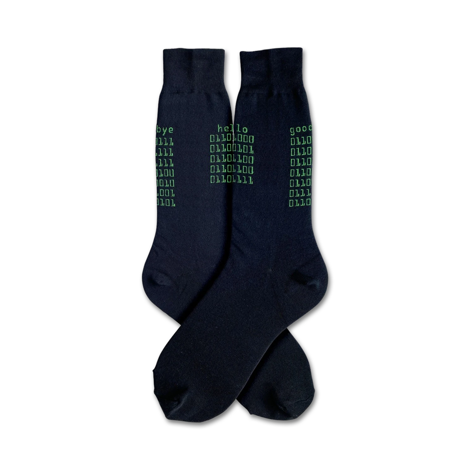 Fancy code cracking socks? These binary code socks will have you feeling like a hacker, programmer, or coder. Plus, the binary code spells out greetings like hello, goodbye, and good which makes these novelty socks especially appropriate for tech meets or online gaming meetups.