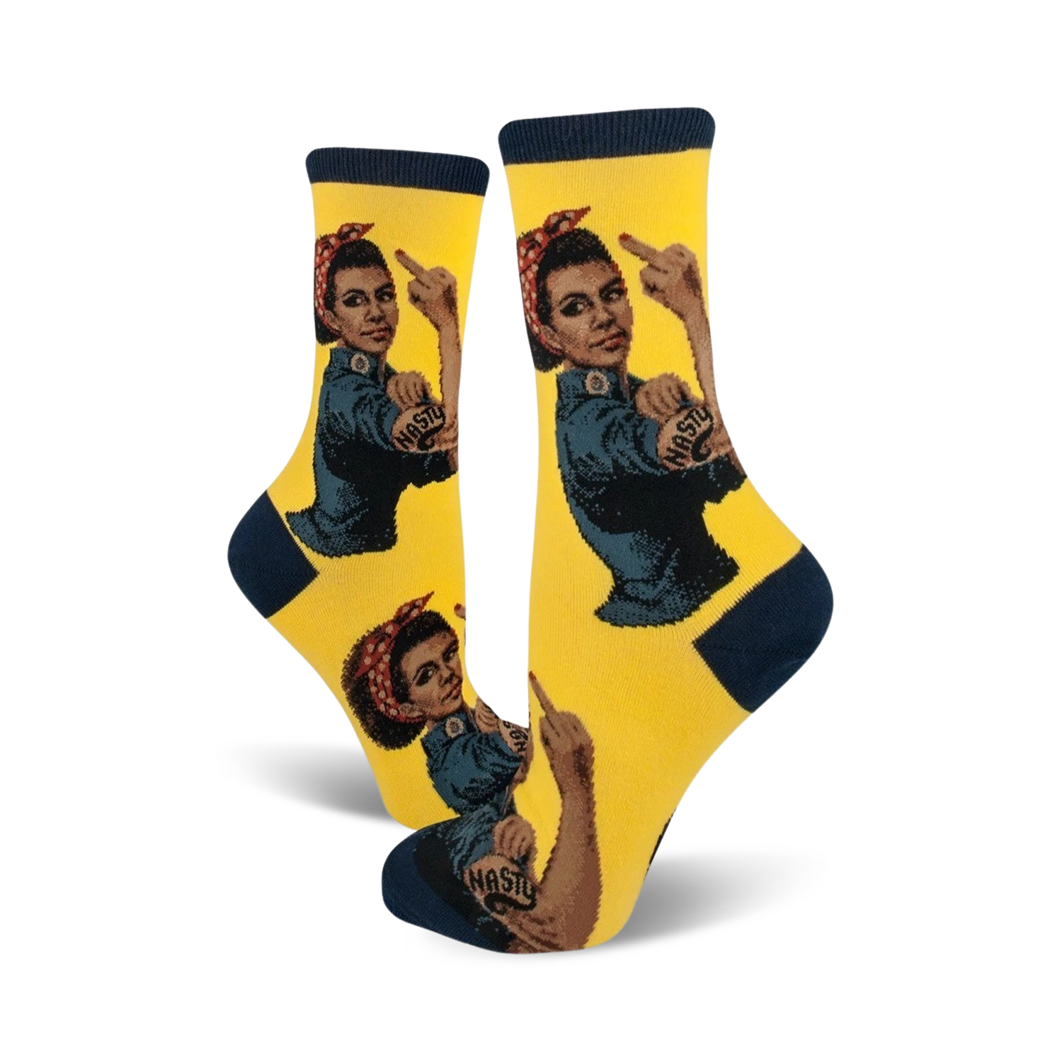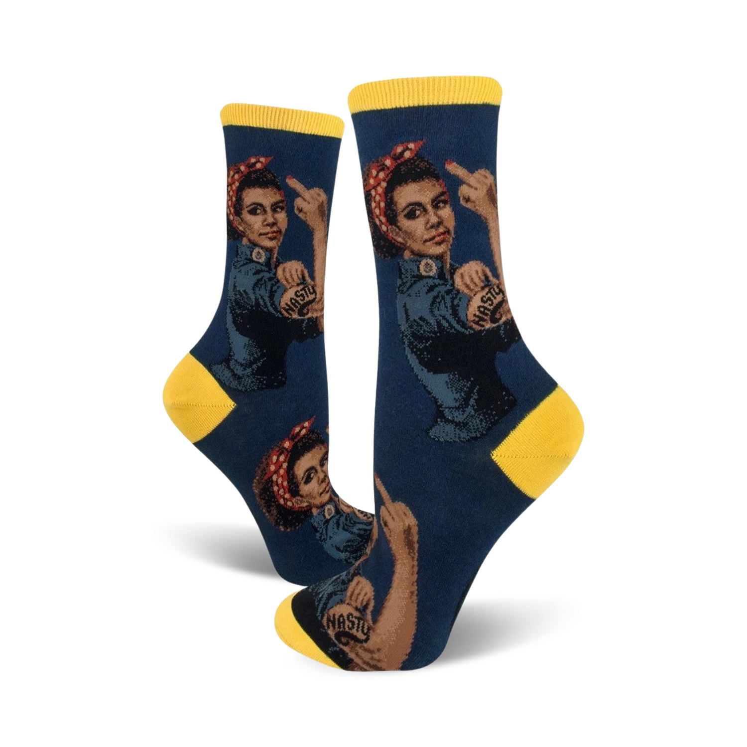 Exhibit fierce feminist vibes with our Black Nasty Rosie socks! Rosie’s iconic middle finger salute becomes a powerful statement on these classic crew socks, infused with unstoppable girl power energy!