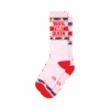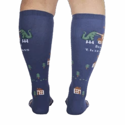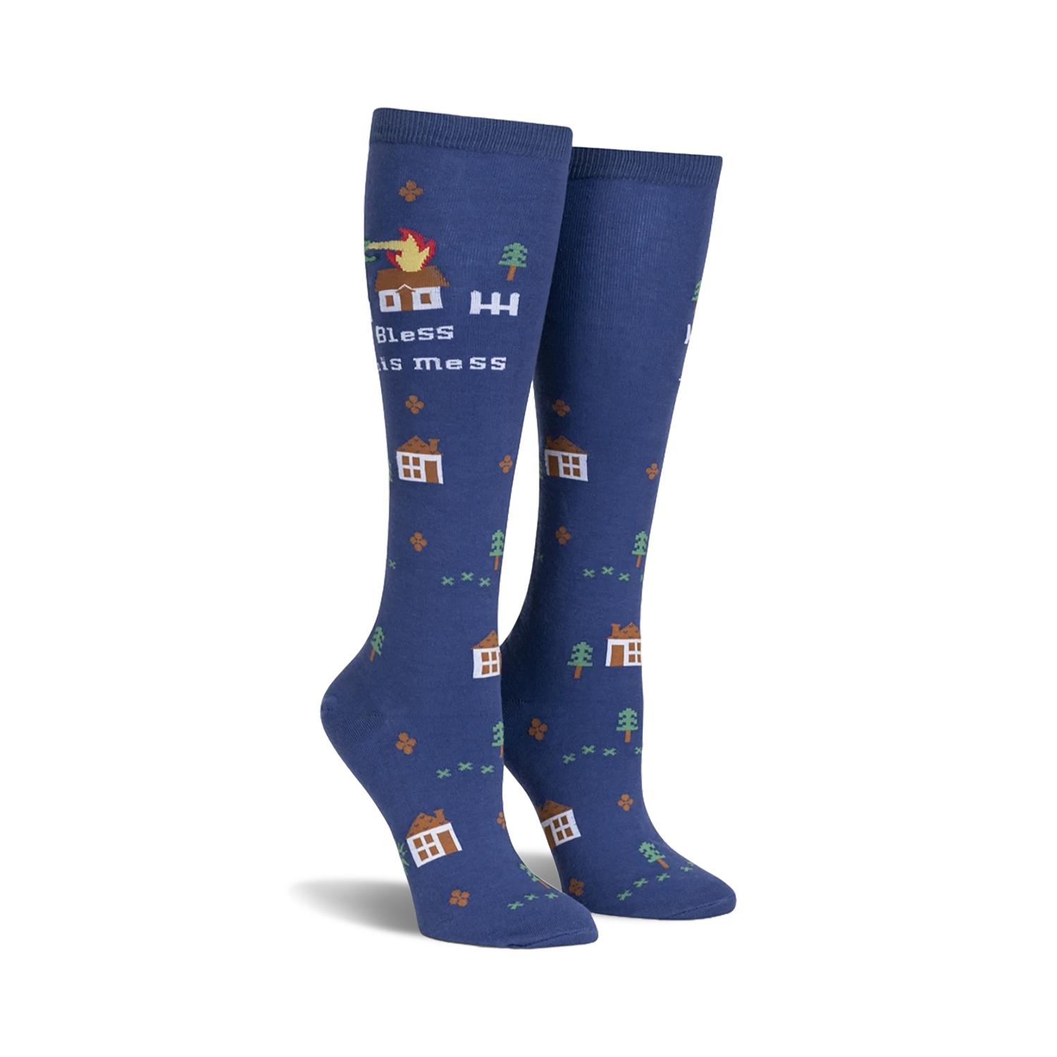 Knee high blue Bless This Mess socks splashed with pixelated houses, trees and flames are a fun, stylish way to add a touch of whimsy to your sock drawer. Inspired by the popular meme, these unique socks are sure to bring a smile to your face and those around you. Who knew chaos could look so cute?