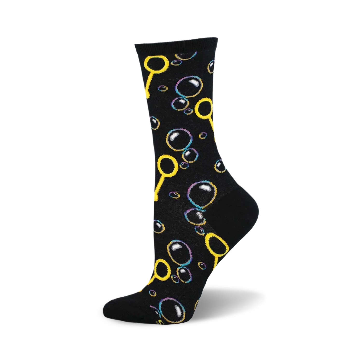 Remember the sheer joy of blowing bubbles as a kid? These “Blowing Bubbles” socks capture that playful magic with colorful bubble and bubble wand designs floating against a sleek black background. Perfect for anyone who loves to add a touch of nostalgia and fun to their day, these socks bring a pop of color and childhood charm to every step.