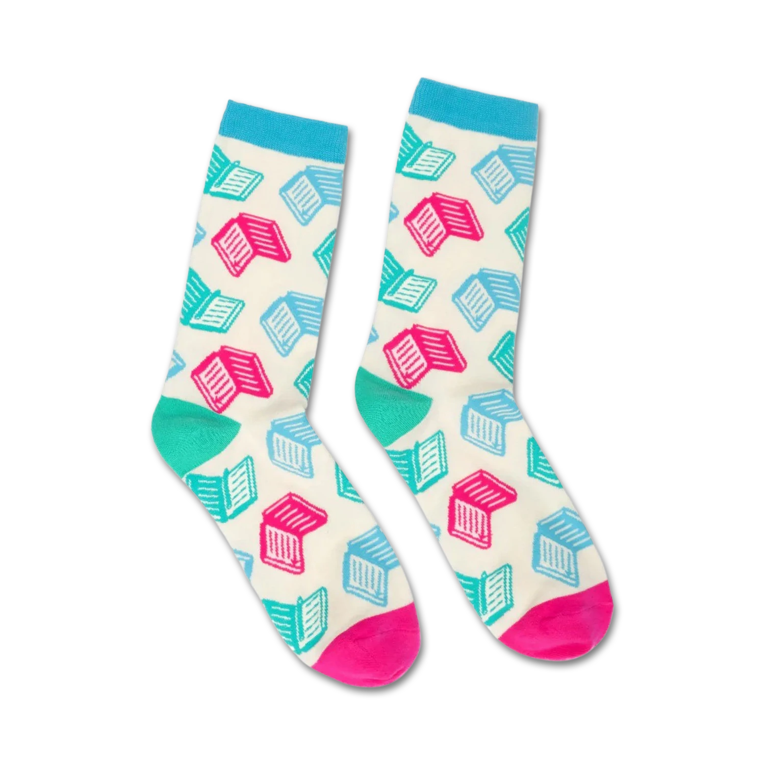 Get your literary toes on with our Books, Books, Books novelty socks! These white crew socks feature a fun pattern of books in pink, blue, and green. Show off your love for reading in style while enjoying the comfort of our soft and durable cotton blend. Whether you’re curling up with a good book or hitting the library, these socks will have you feeling like you’re stepping into your own personal library.