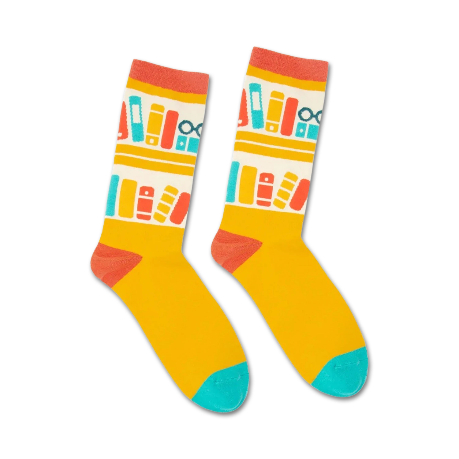 With these bookworm beauties gracing your tootsies, you’ll be reading socks appeal! These vibrant yellow socks feature a bookshelf design with books in bright blue, orange and redperfect for when you need a literary lift!