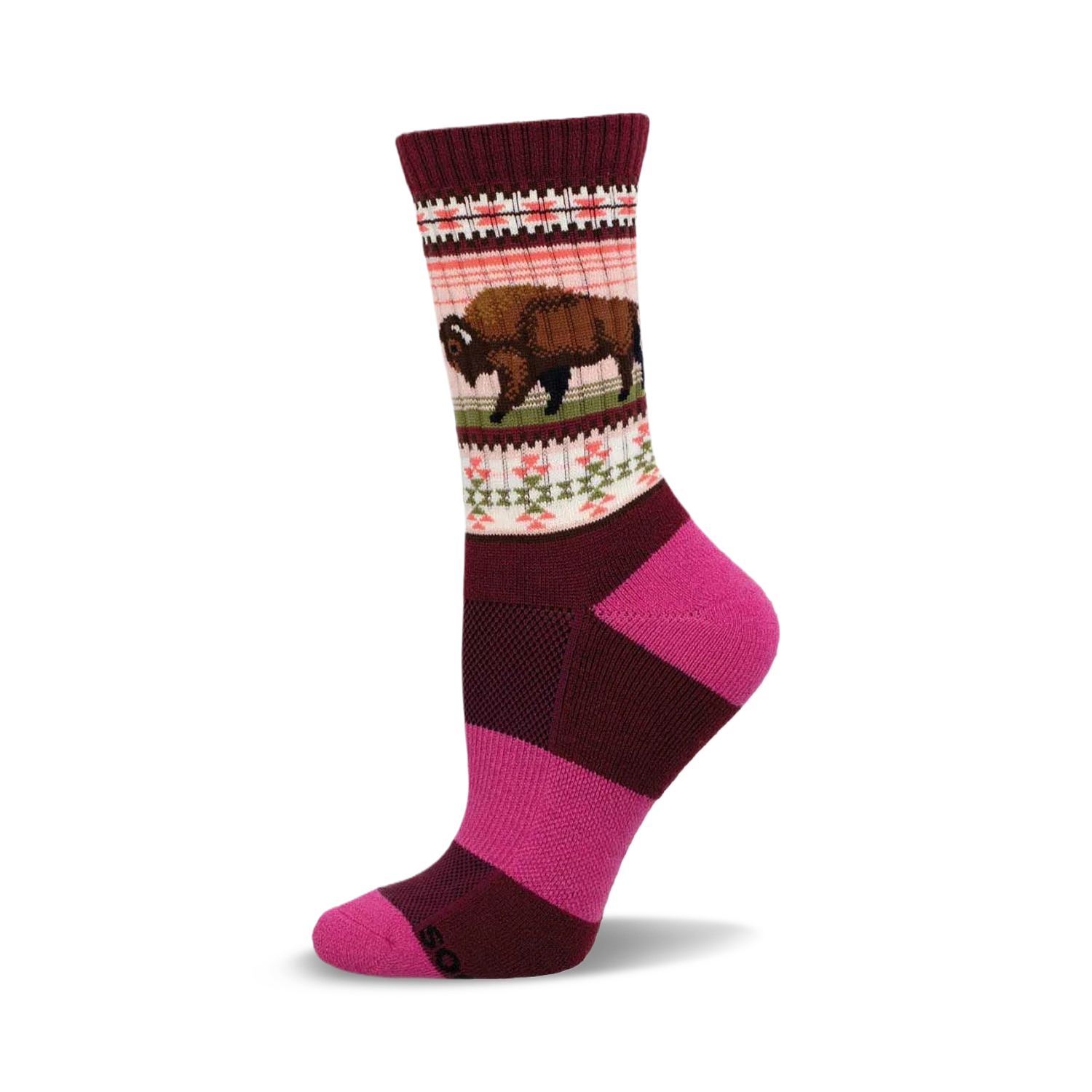 Rugged, resilient, and ready for anythingjust like the mighty buffalo. Our COMPASS Merino wool socks bring together durable comfort and rich details, featuring a cushioned footbed and light compression arch support. Whether you’re scaling mountains or navigating city streets, these pink and maroon beauties with a brown bison and geometric pattern are your perfect adventure companions.