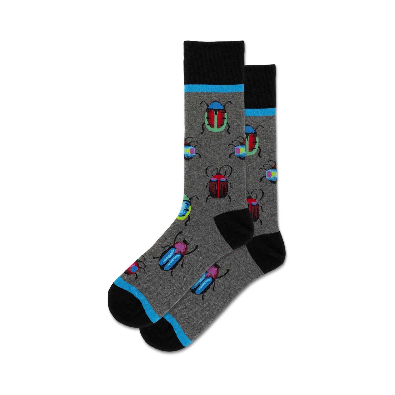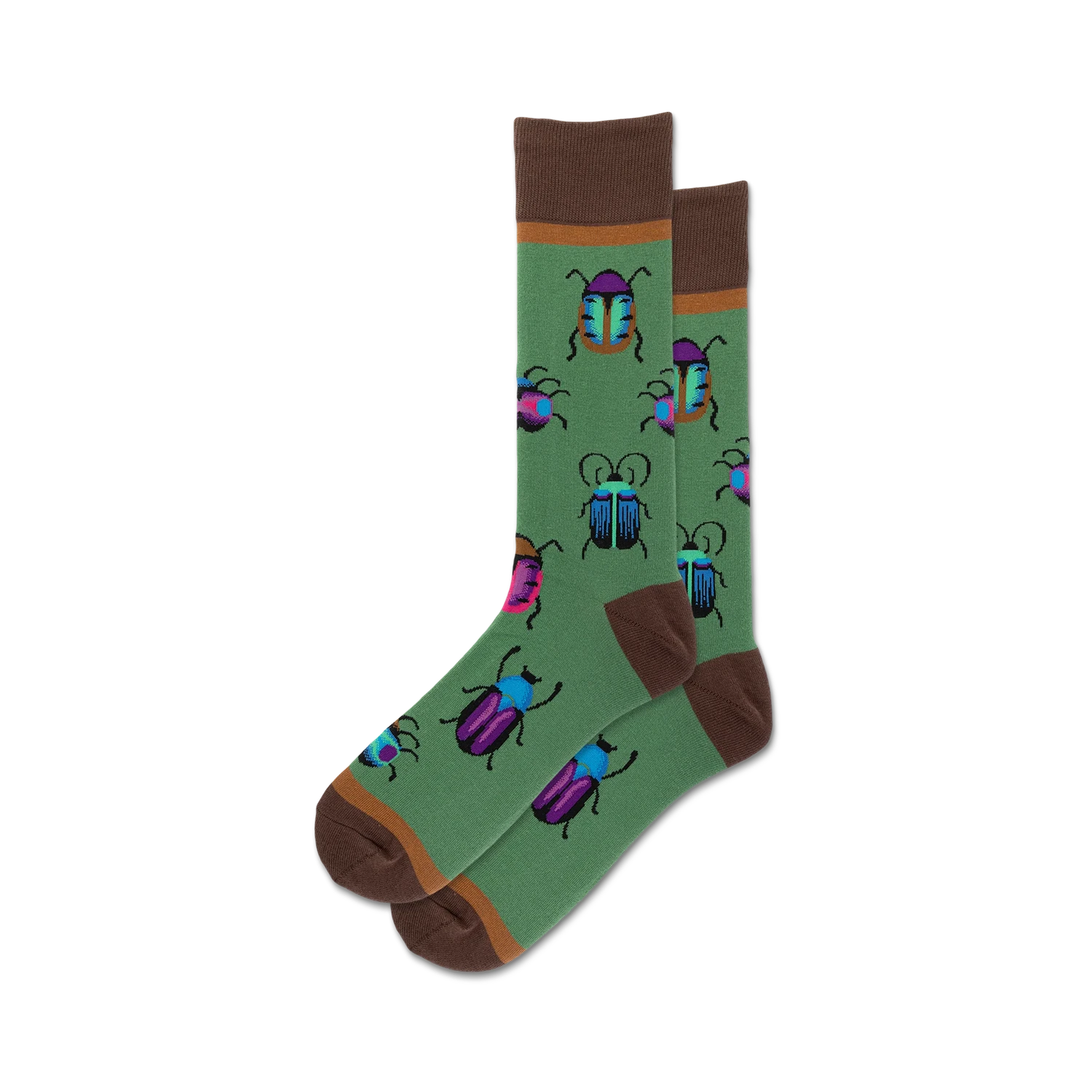 Buggin’ Out: Bugs Beetles Crew Socks for Men Our Bugs Beetles Crew Socks are swarming with style and buzzing with fun! These crew-length socks feature a vibrant green background covered in a kaleidoscope of multi-colored beetles. Whether you’re a bug enthusiast, nature lover, or just someone who appreciates a good pun, these socks are sure to make you smile. Plus, they’re made with high-quality cotton that’s soft and comfortable to wear all day long. So slip on a pair of Bugs Beetles Crew Socks and let your feet take a walk on the wild side! Fact: Beetles are the most diverse group of insects on Earth, with over 350,000 known species. That’s more than all other types of insects combined! Fact: Some beetles can fly, while others are flightless. The flightless beetles have evolved to use their legs for walking, running, and even jumping. Fact: Beetles come in all shapes and sizes. The smallest beetle is about the size of a pinhead, while the largest beetle can grow to be over 6 inches long, they’re also super hardy and can survive in polluted water.