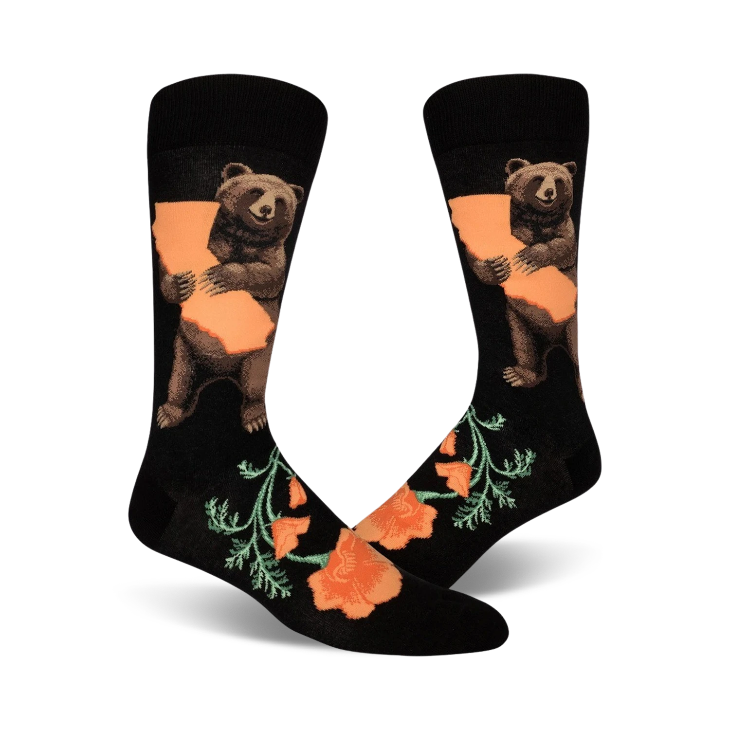 California Bear Hug: Crew socks for men with a pattern of brown bears hugging California, topped with orange accents like California poppies! Whether you’re a native, a transplant, or just a fan of the Golden State, these socks will surely give you a warm, fuzzy feeling βfor your feet at least!