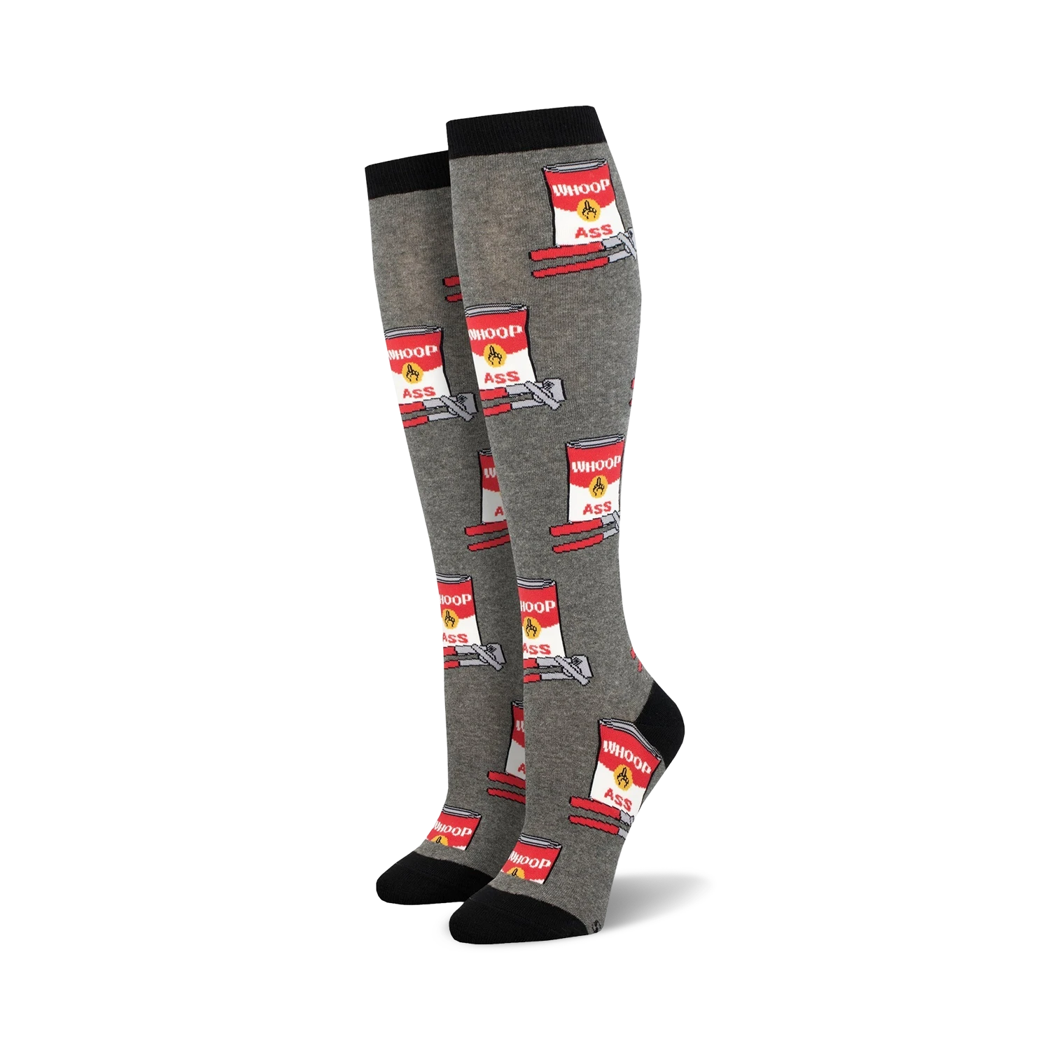 These Can of Whoop Ass Knee High Socks for Women will have you dishing out plenty of laughs this season. With a witty “WHOOP” can design, you’ll find yourself in splits of laughter. These grey beauties feature adorable can openers sitting above the text. Be sure to wear a fresh pair to your next stand-up or when you’re feeling a bit down and need a pick-me-up. These funky kicks are cute, and comfy. So whoop, there it is, it’s time to stock up on some whoop ass!