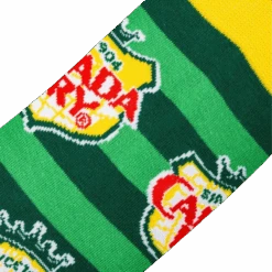 Gaze upon these socks ”a green spectacle with yellow toes, heels, and cuffs. Adorned with red shields, crowned in yellow, and emblazoned with the proud proclamation, “Canada Dry” in green, these socks are a tribute to the iconic ginger ale. A yellow stripe encircles the socks, adding a touch of zest. Don these socks, and feel the bubbly spirit of Canada Dry invigorate your feet.