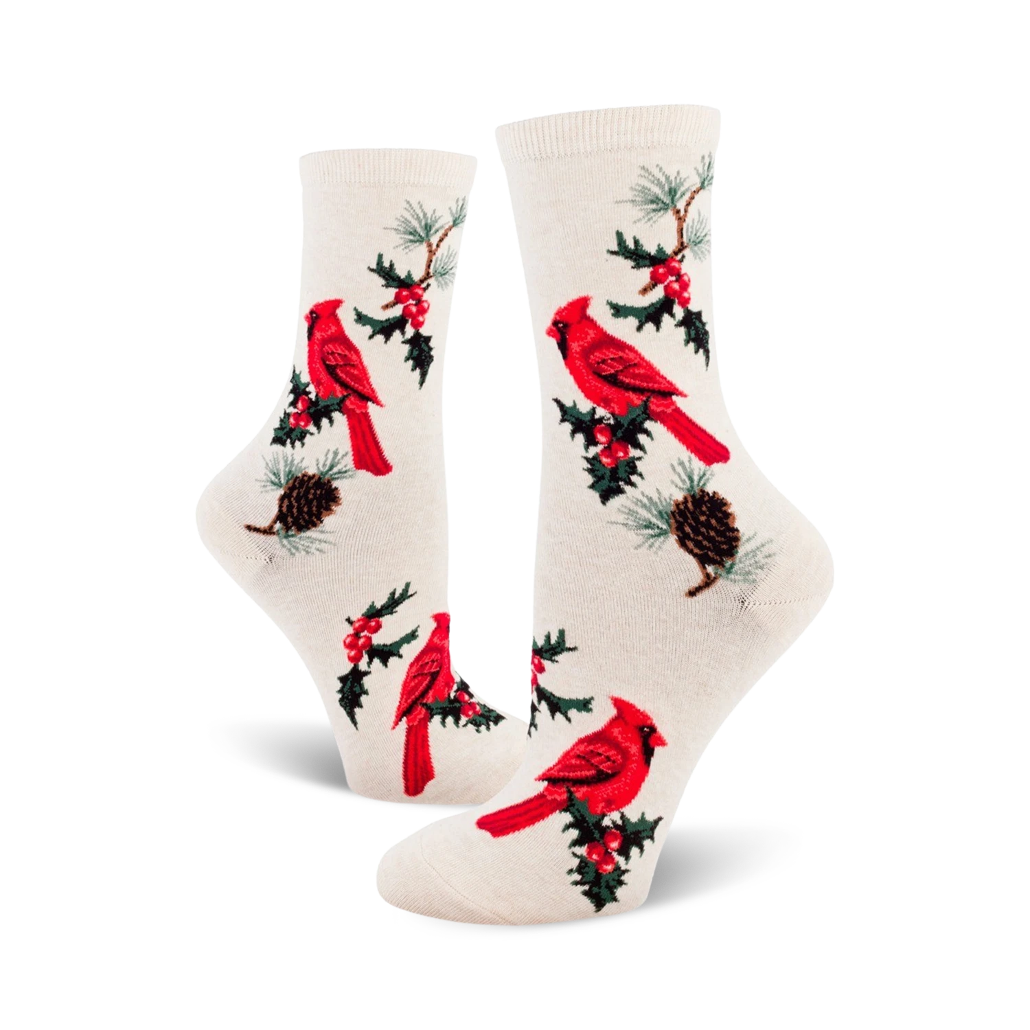 The cardinals are calling your feet home! Perch up and fly high in these spirited cardinal socks. Featuring a chorus of cardinals perched atop pine boughs and berries, this crew-length sock is ready to help you take flight. Made especially for women, these white socks are ready to add a joyous dash of color to your sock drawer.
