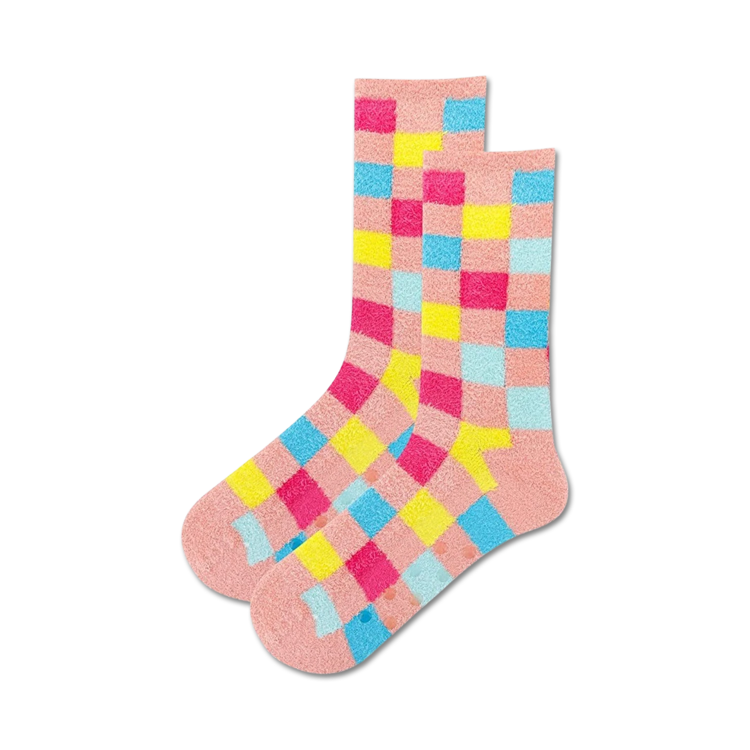 Checkers Non-Skid Crew Socks for Women: These checkered socks bring the fun of a classic board game to your feet in lively pink, blue, purple, and gray squares. Stay steady with non-skid soles, and embrace the quirky charm of these crew socks made for the modern-day fashionista.