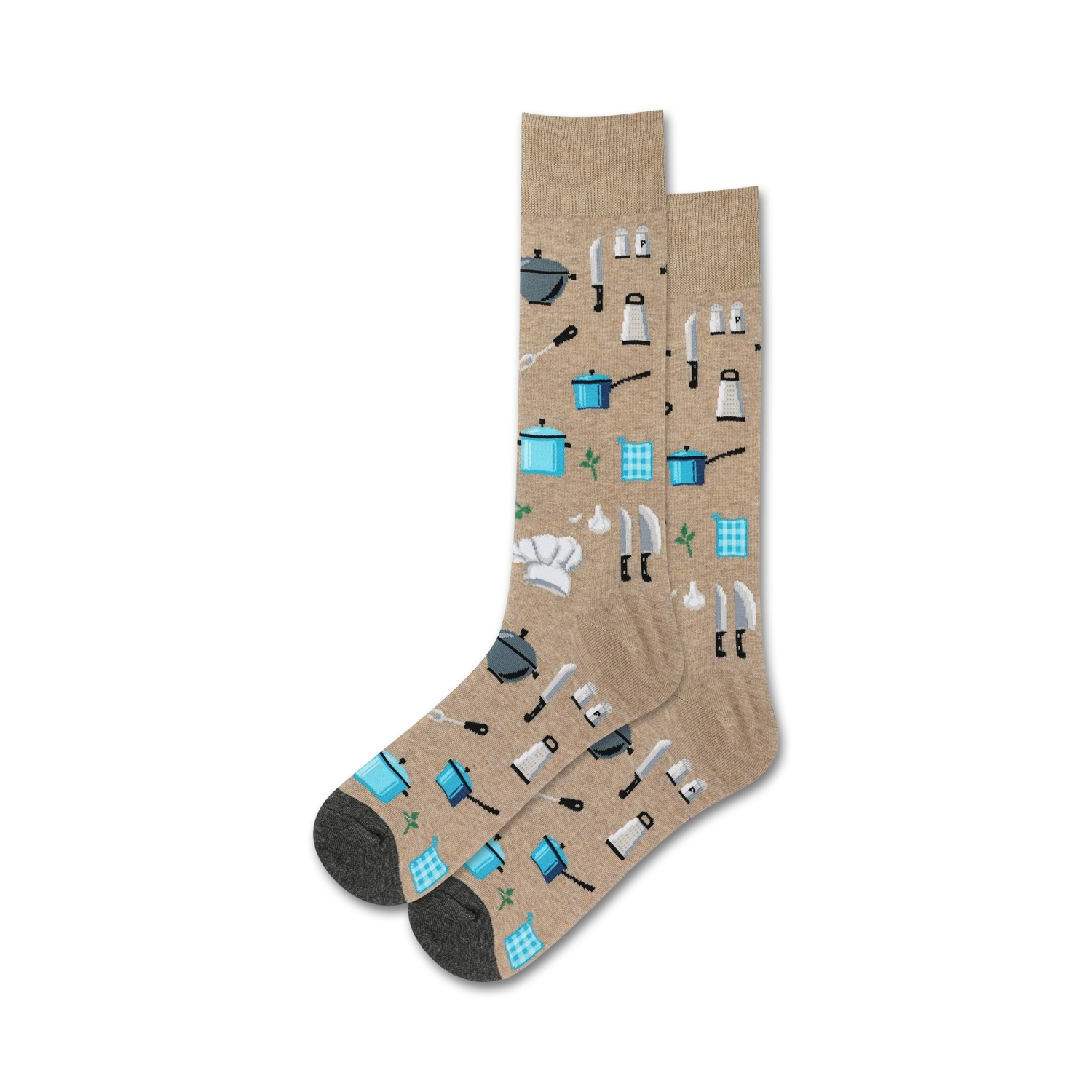 Chef Tools Socks by Hot Sox are the perfect gift for that socks lover in your life. These kitchen themed mens crew socks come in multiple color Options and fit Men’s Shoe Size 6-12.5. Made of 49% Cotton 27% Polyester 21% Nylon 3% Spandex for comfort and durability. A pair of these cool Kitchen novelty Socks will certainly give any wardrobe an instant upgrade. Machine Wash Cold, Inside Out. Only Non-Chlorine Bleach when needed. Tumble dry low. Do not iron.