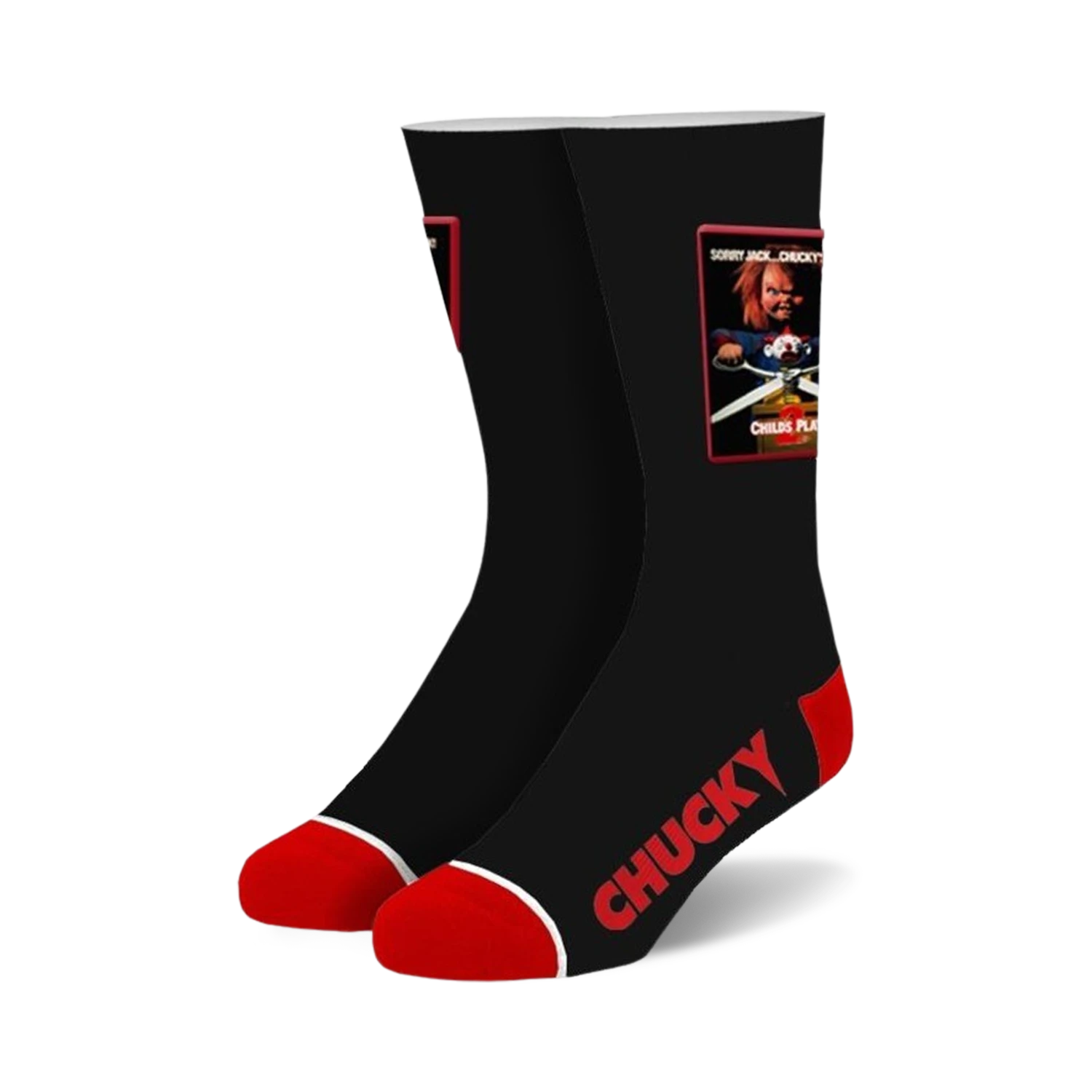 Channel your inner horror fan with these wicked Chucky Patch socks! Featuring a striking black and red design, these socks showcase a large patch emblazoned with the iconic Chucky, complete with his overalls and menacing smile. Perfect for both men and women, these crew-length socks are a must-have for movie buffs and horror enthusiasts. Get ready to bring some spooky style to your feet!
