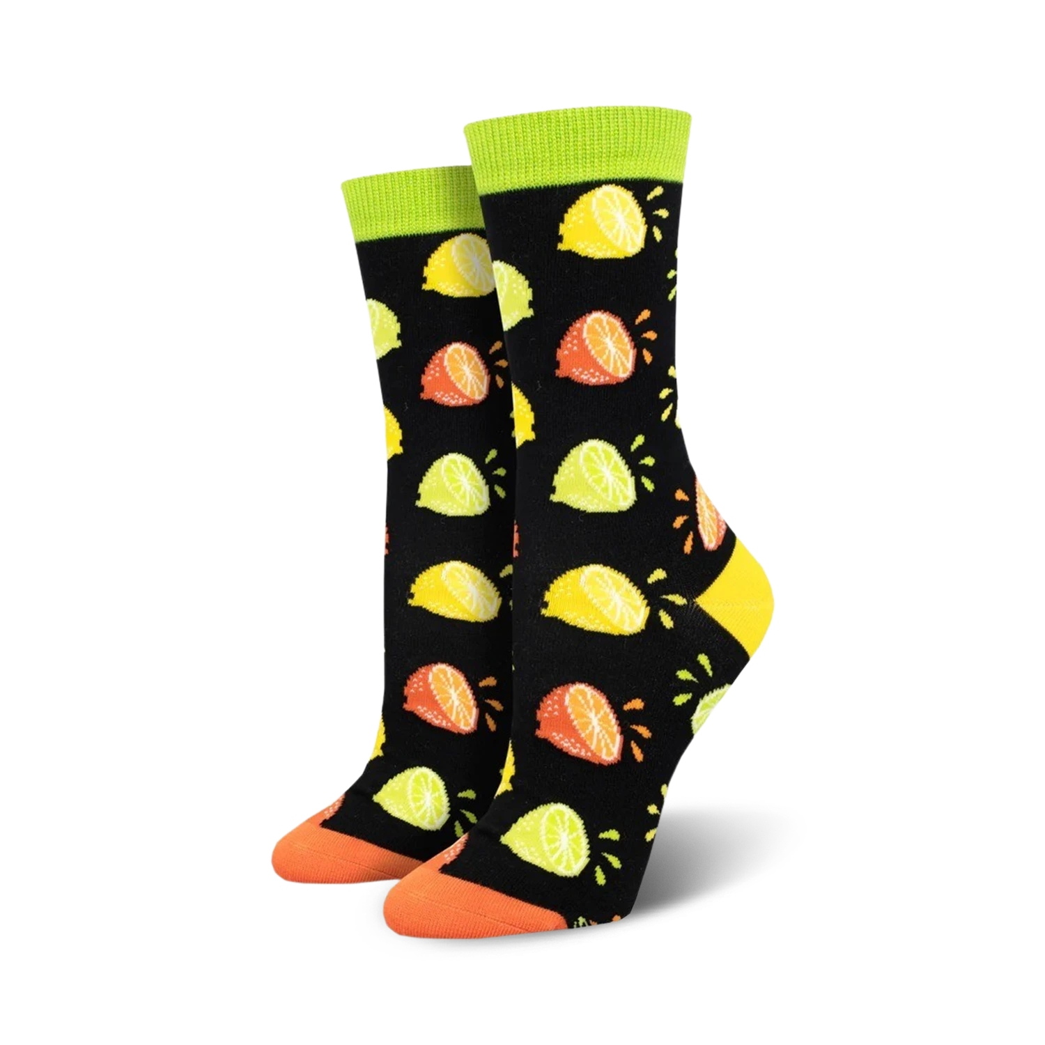 Squeeze some zing into your sock game with our Citrus Squeeze Bamboo Crew Socks! These sweet kicks are bursting with juicy lemons, limes, and oranges on a black canvas, finished with a cheerful green cuff and a zesty orange toe. Get ready to add a refreshing pop to your everyday style!