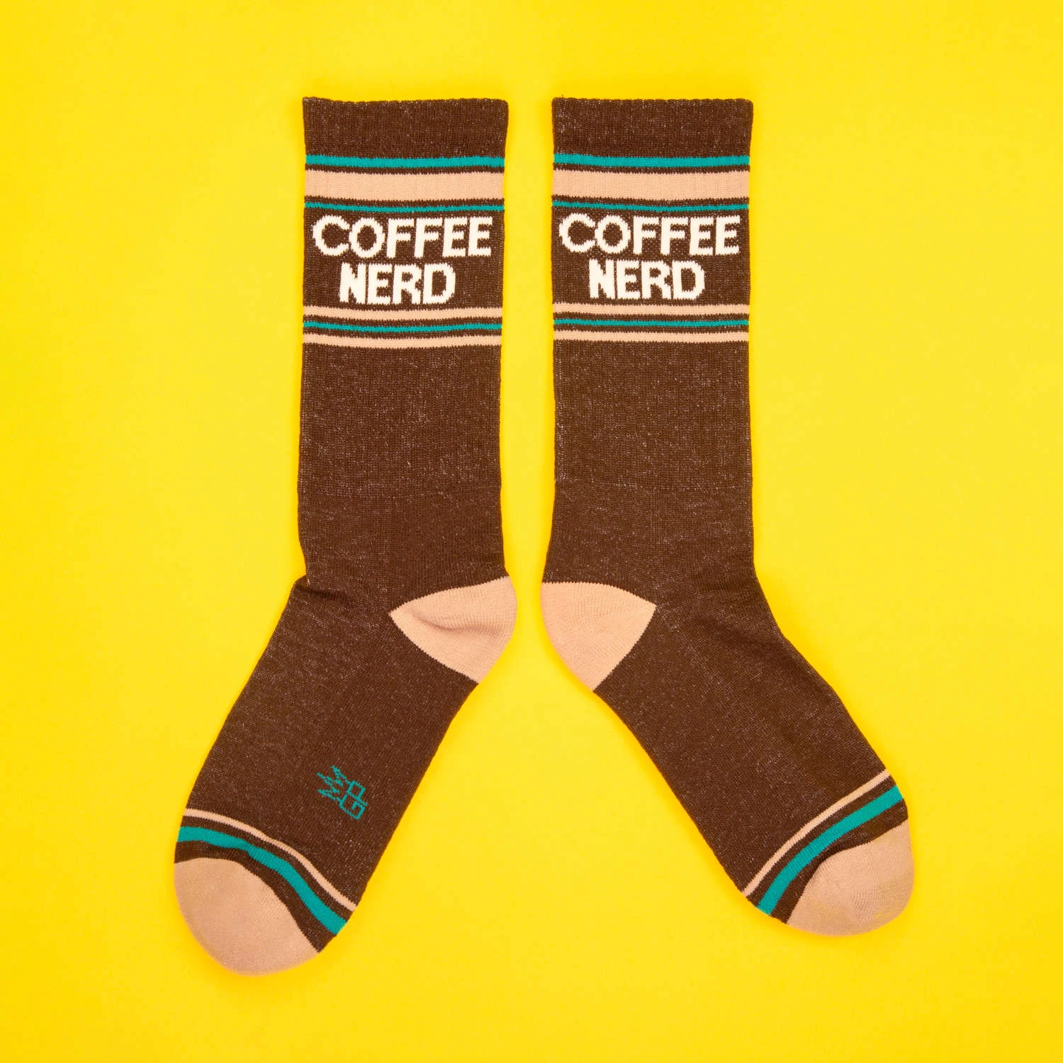 Coffee aficionados, rise and grind! These socks are the perfect brew for those who savor every bean and boast an encyclopedic knowledge of all things coffee. Crafted with love in the USA, these super-comfy, unisex gym socks are a one-size-fits-most treat for your feet. With a rich brown cotton base and striking accents of teal, bean taupe, and cream nylon, they blend style and comfort, making them a must-have for every Coffee Nerd out there.
