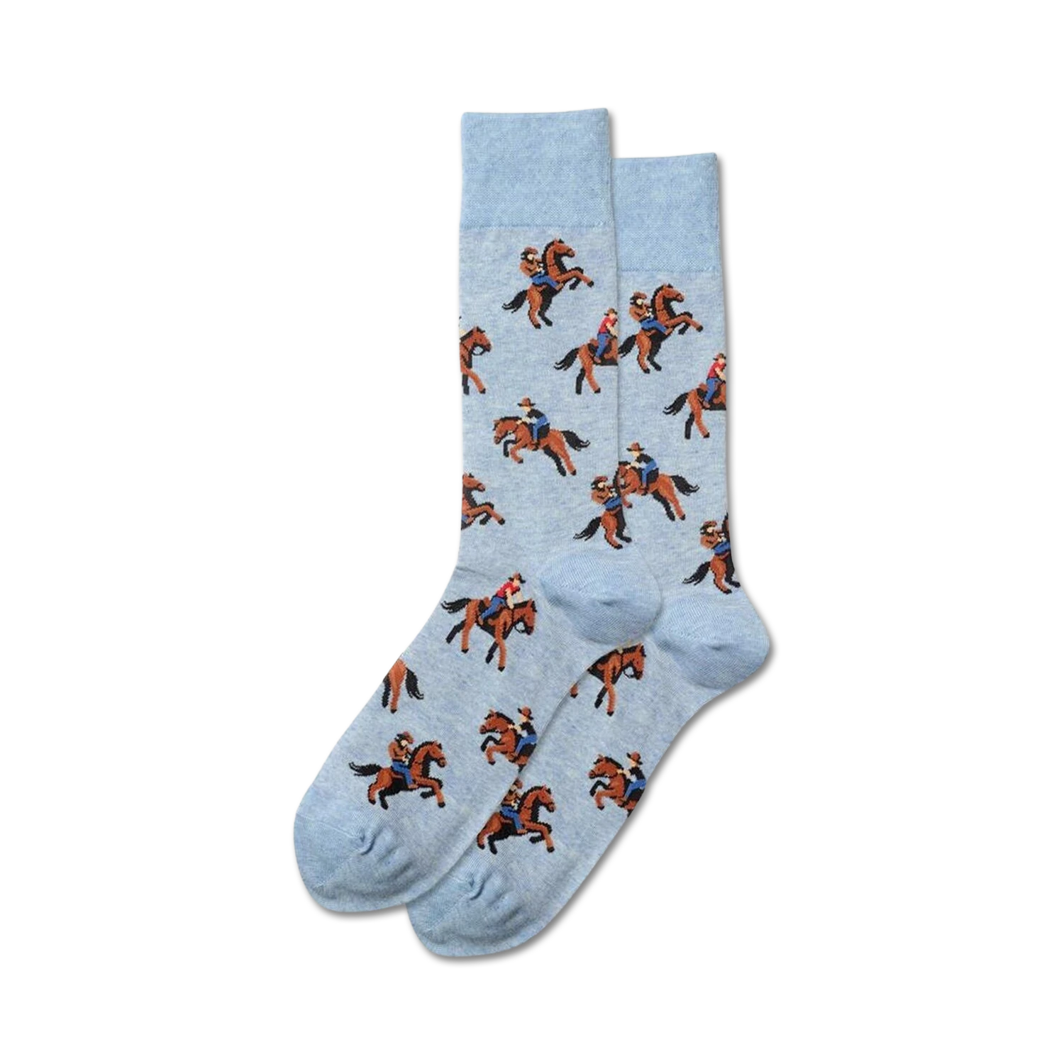 Lasso yourself a pair of these rootin’, tootin’ cowboy socks and add some yeehaw to your step! Channel your inner cowboy and strut your stuff in these buckin’ bronco crew socks, featuring a lively pattern of cowboys ridin’ high. Howdy, partner! You’ll be the talk of the town with these kickers.