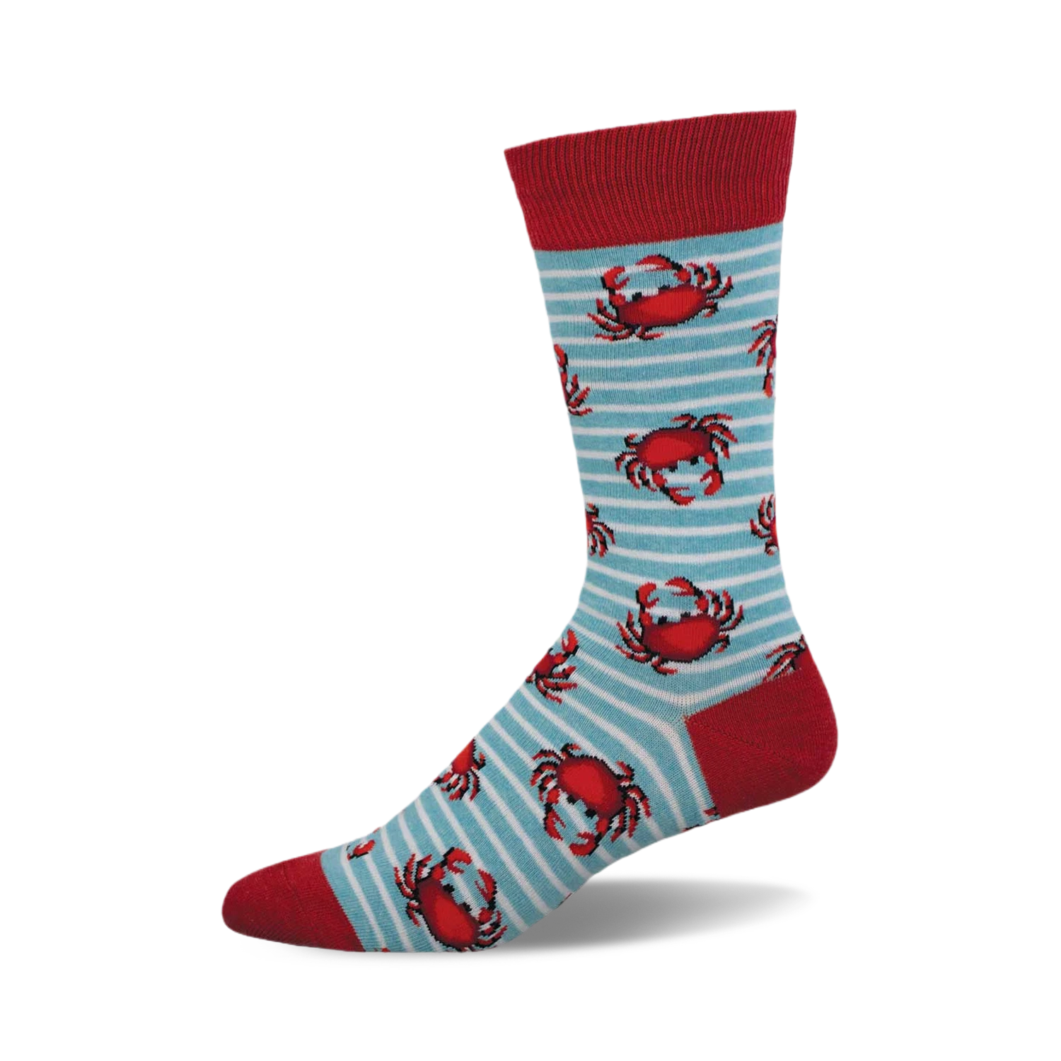 Ever notice how crabs, with their sideways shuffle, seem to have a unique rhythm of their own? Now, imagine channeling that same quirky charm right onto your feet. The Crabby Crew socks are here to shake up your sock drawer with a dance of vibrant red crabs on a serene light blue sea, topped with a bold red crown. These delightful crustaceans promise to lift your spirits and keep you anything but crabby.