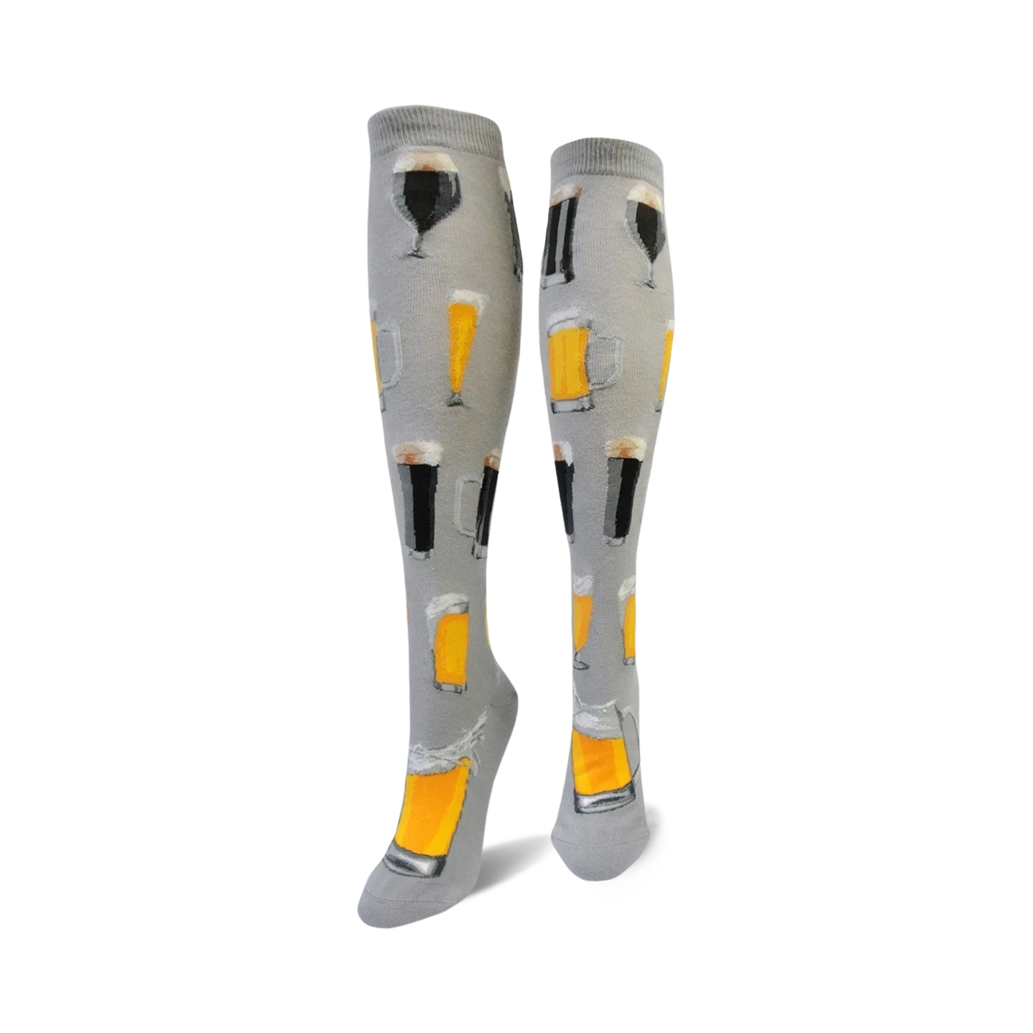 Have a knee-slapping good time with these Craft Beer socks! Show off your love for all things beer with this Knee High Women’s gray sock featuring a pattern of light and dark beer glasses and mugs. These socks are so cool, they just might make you foam at the mouth.
