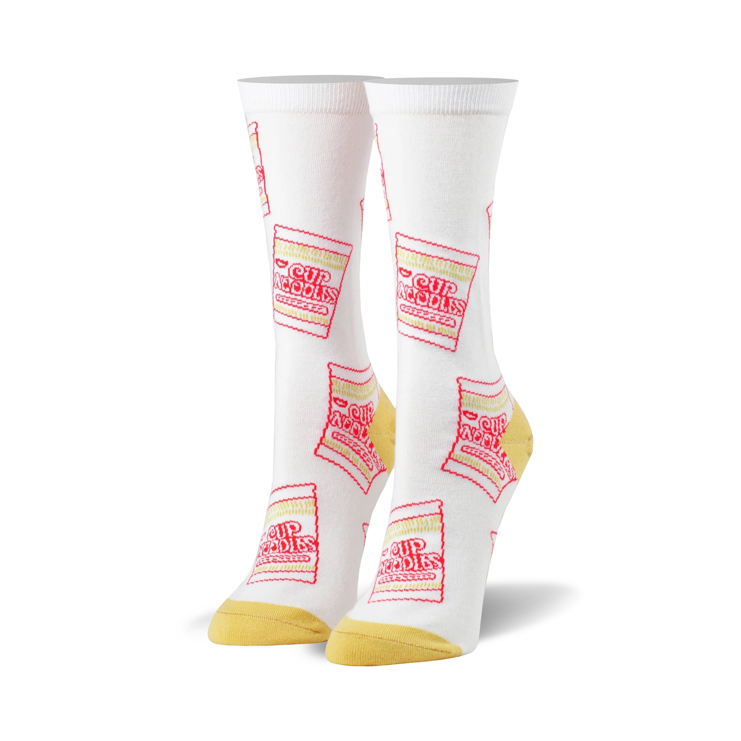 “Cup Noodles fanatics, embrace the taste of fun with our Cup Noodles Cup Crew Socks! These white socks feature an allover print of red and yellow Cup Noodles soup packages, complete with the iconic Cup Noodles logo. Just like the beloved instant noodles, these socks bring a burst of energy to your feet, keeping you comfy and stylish. Show off your love for Cup Noodles and your playful side with every step.”