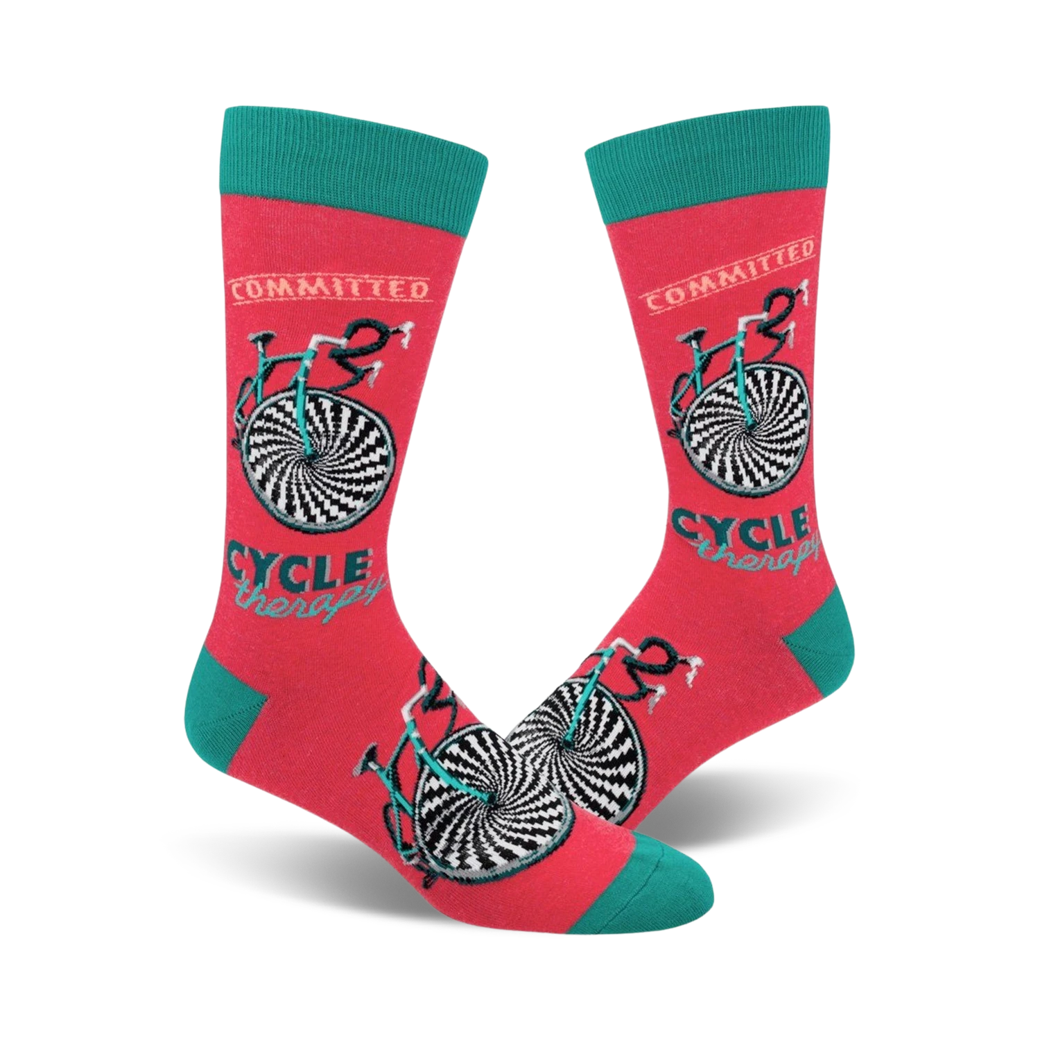 Cycle Therapy crew socks will take you on a thrilling ride thanks to their eye-catching design. Rock these vibrant pink socks adorned with a teal green bicycle and the phrase “Committed…Cycle Therapy.” Say aloha to smiles and compliments as you pedal your way through your day, spreading positive vibes on two wheels. Embrace the spirit of cycling and infuse your wardrobe with a touch of audacious fun.