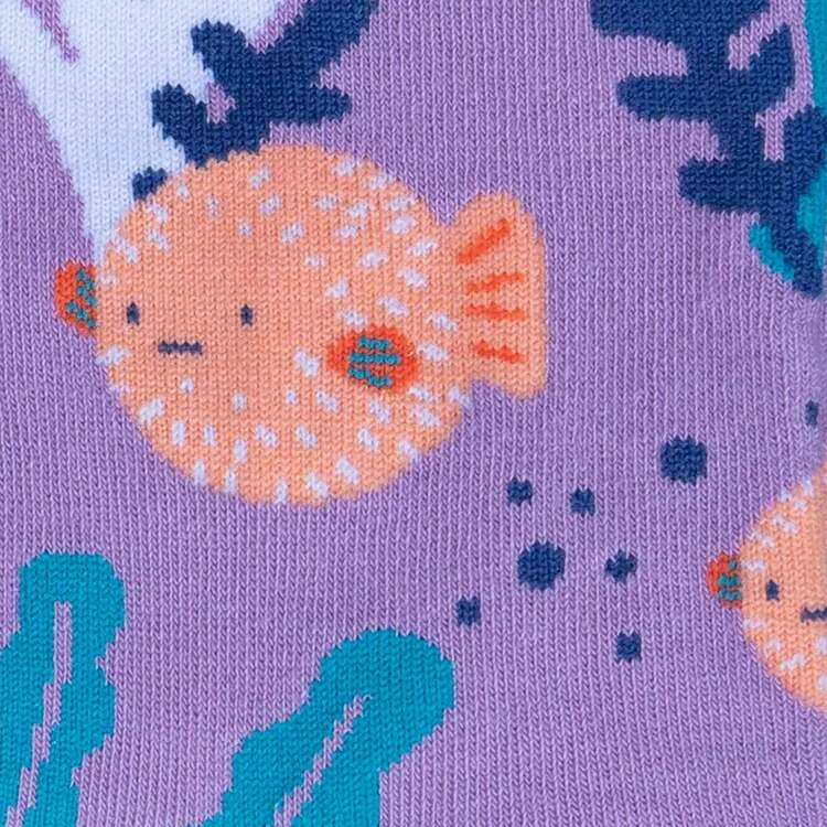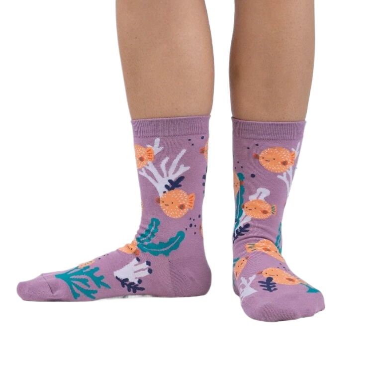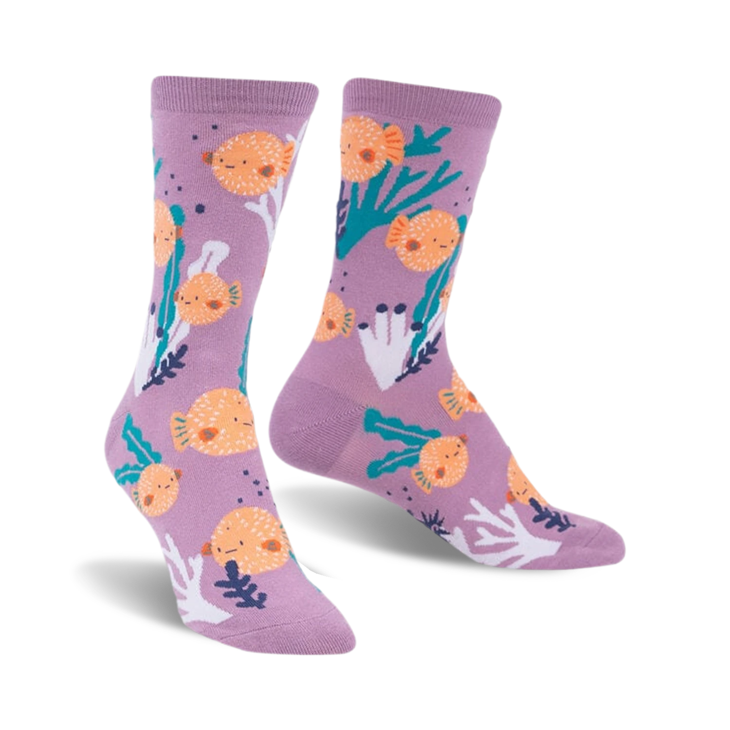 If you think pufferfish are just sea creatures, think again! These vibrant socks showcase the ocean’s quirkiest inhabitants, turning your feet into a canvas of marine wonder. With a splash of orange pufferfish playfully swimming through seaweed and coral designs, these socks are a spirited tribute to the 120 species of pufferfish that add a dash of puff and personality to our oceans.