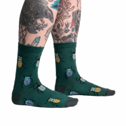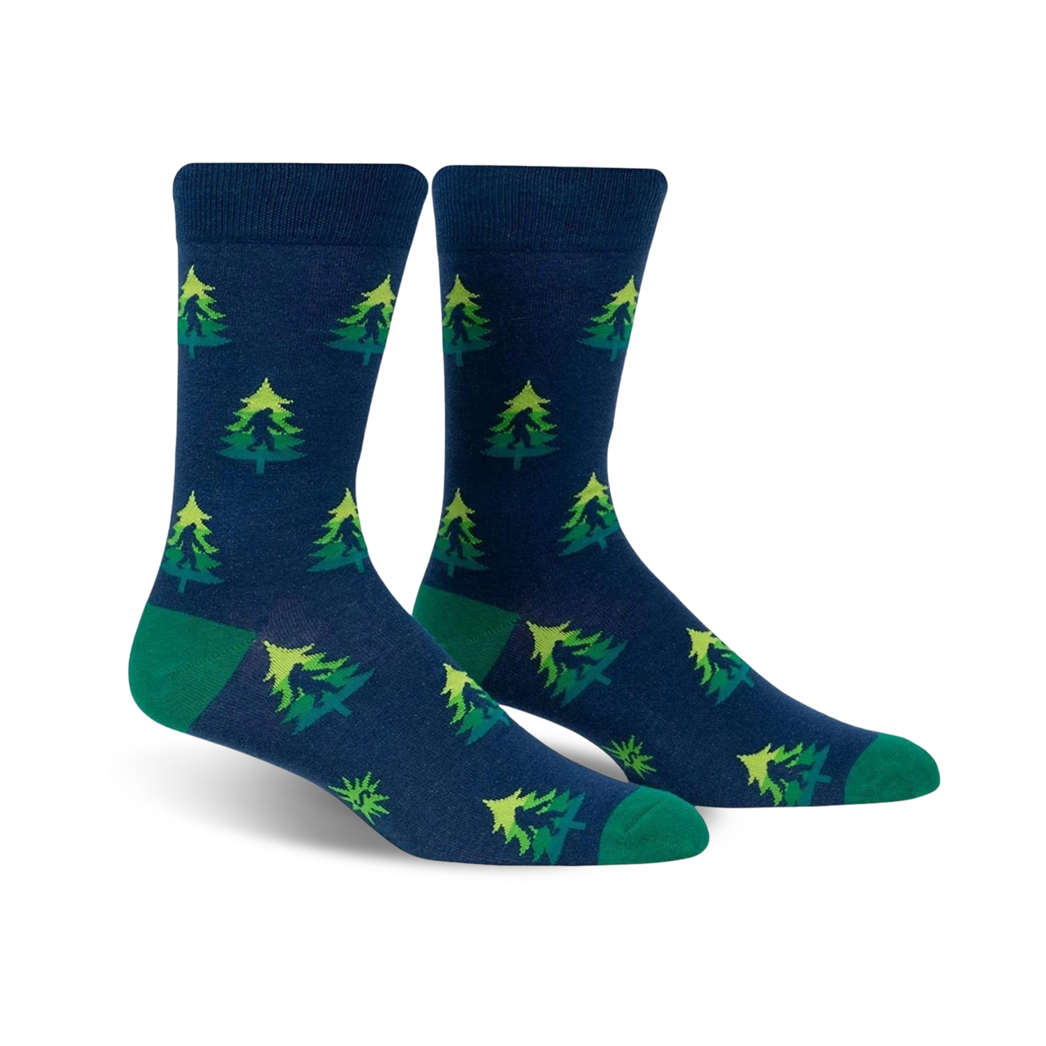 Walk through the forest with Bigfoot with these fun, bright crew socks. If you’re looking for a sock that’s perfect for nature walks or hanging out at home, these dark blue crew socks feature a pattern of green pine trees with green toes and heels.