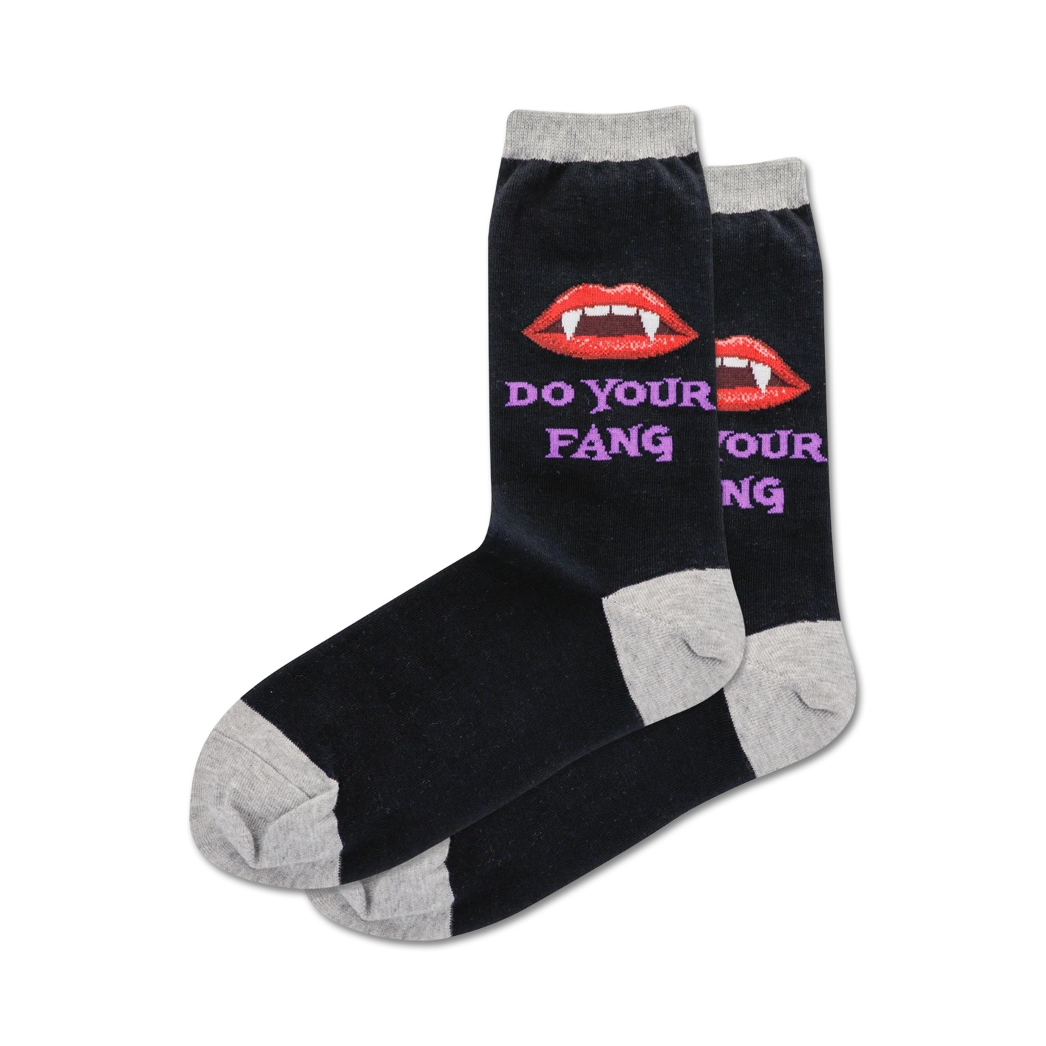 Put the bite on with Do Your Fang socks. A gray and black crew sock you’ll sink your teeth into. These bad boys are covered in a pattern of bright red lips and sharp vampire fangs. Wear your Do Your Fang vampire socks to your next Halloween party or wear them to add a little spooky flair to your everyday wardrobe. Inspired by the hottest undead trend sweeping the nation, you won’t want to miss out on a “fang”-tastic pair of socks to add a “bloody” good time to your accessories.