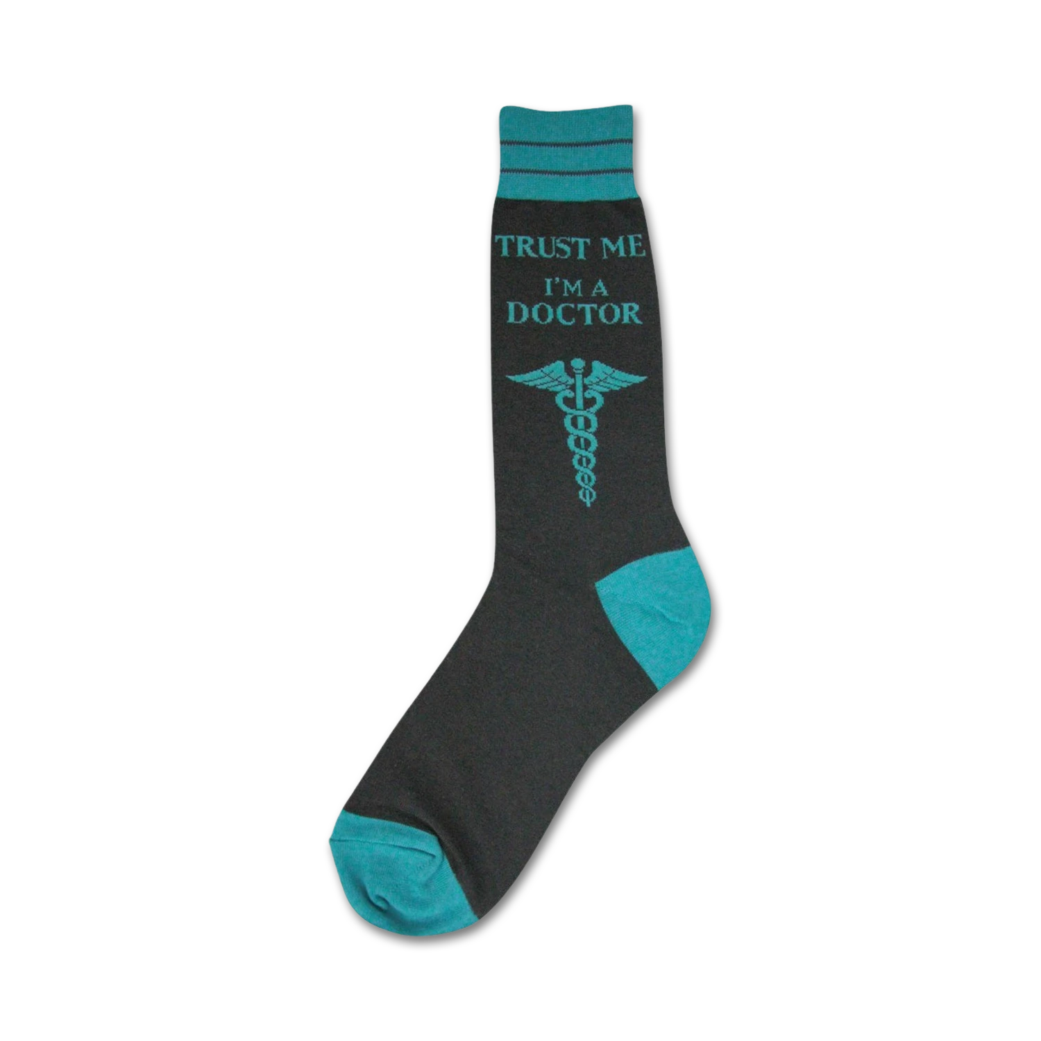 Doctor Socks, pair of black crew socks with turquoise toes, heels, caduceus symbol, and text ‘Trust me I’m a Doctor.’ These socks are perfect for medical professionals wanting to add a bit of humor to their scrubs or give as a gift to your favorite doctor, nurse, or medical student.