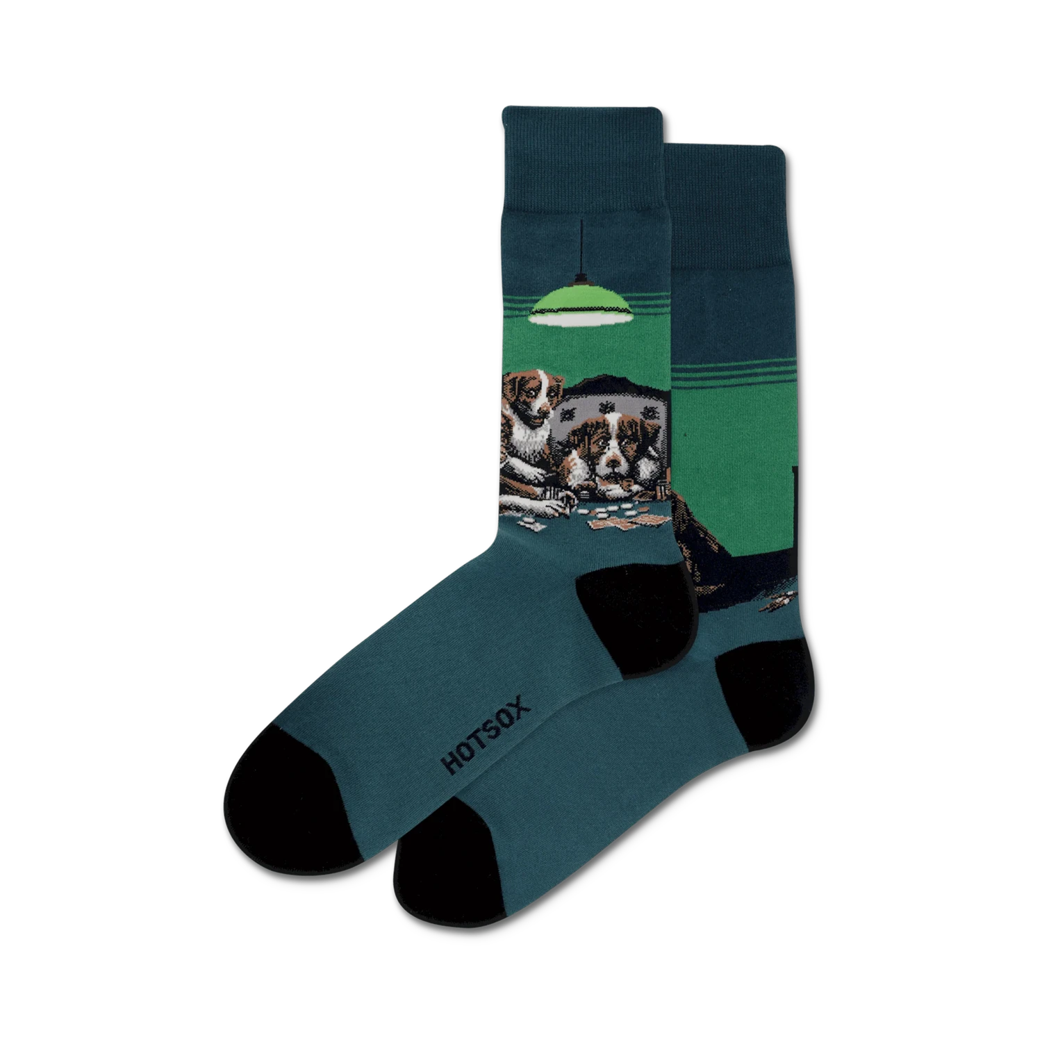 Feast your eyes on these dog poker game socks! Watch the pups stare down at their cards, each hoping to win the pot. Who will come out on top? Only time will tell. Put on these dark green crew socks for men and let the good times roll! Walk a mile in these cool dog-themed, playing poker novelty socks!