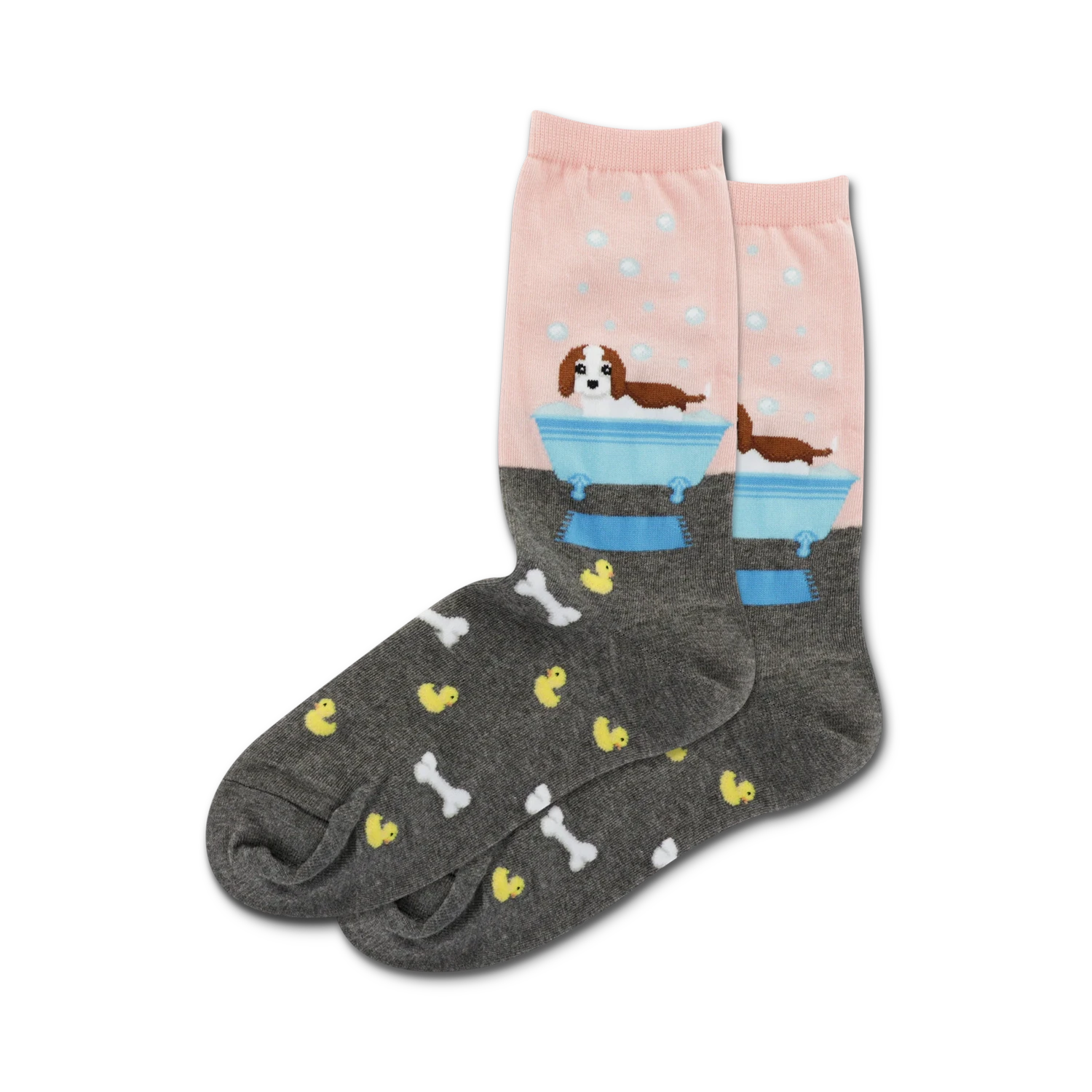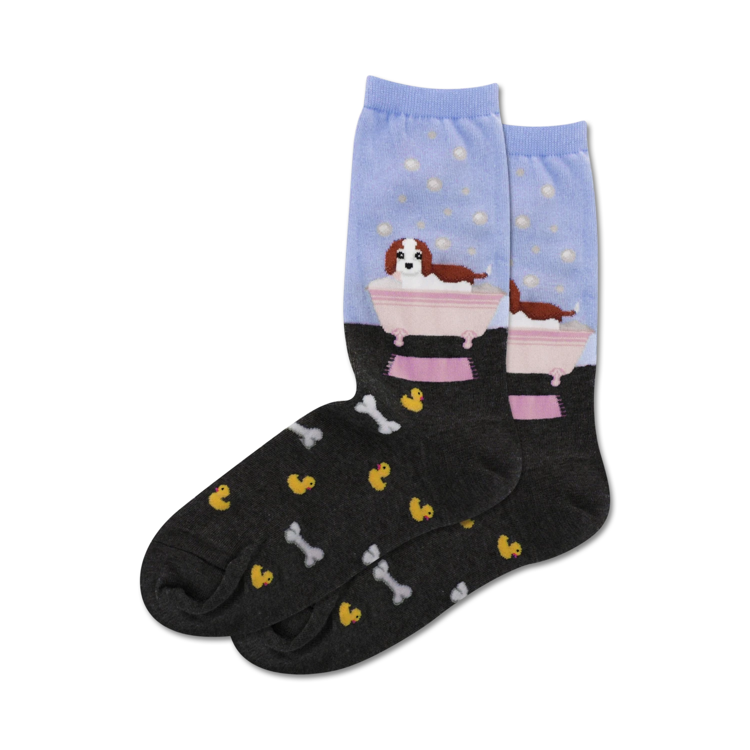 Who let the dogs out? Doggie Bath Time socks let you take your furry friends wherever you go. Don’t worry if they get dirty, they’re machine washable! These crew length socks feature a pattern of yellow rubber ducks and bones on the black part of the socks with a bathtub with a dog in it on the blue part. They’re cozy, comfortable, and stylish. You won’t want to take them off, even after bath time is over.