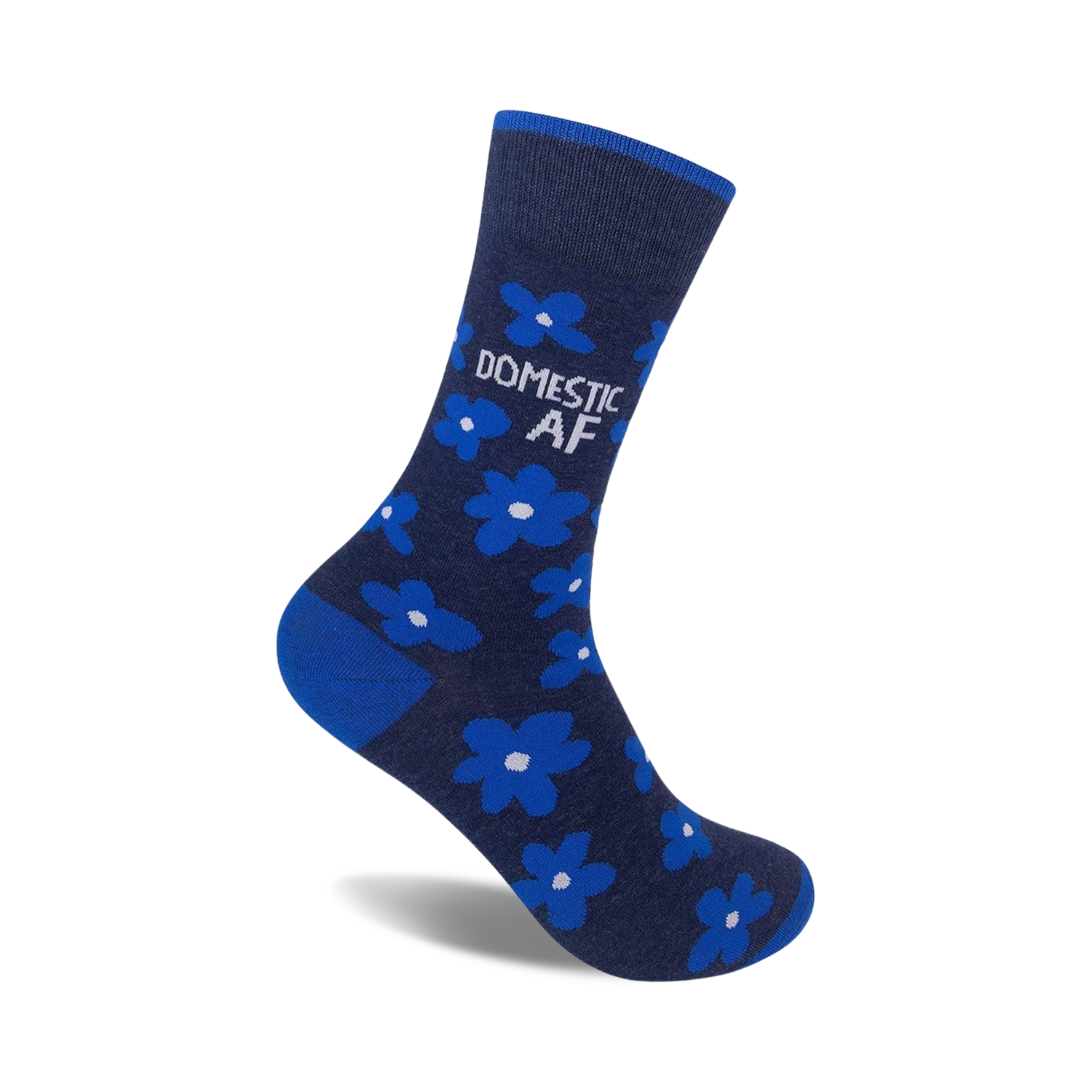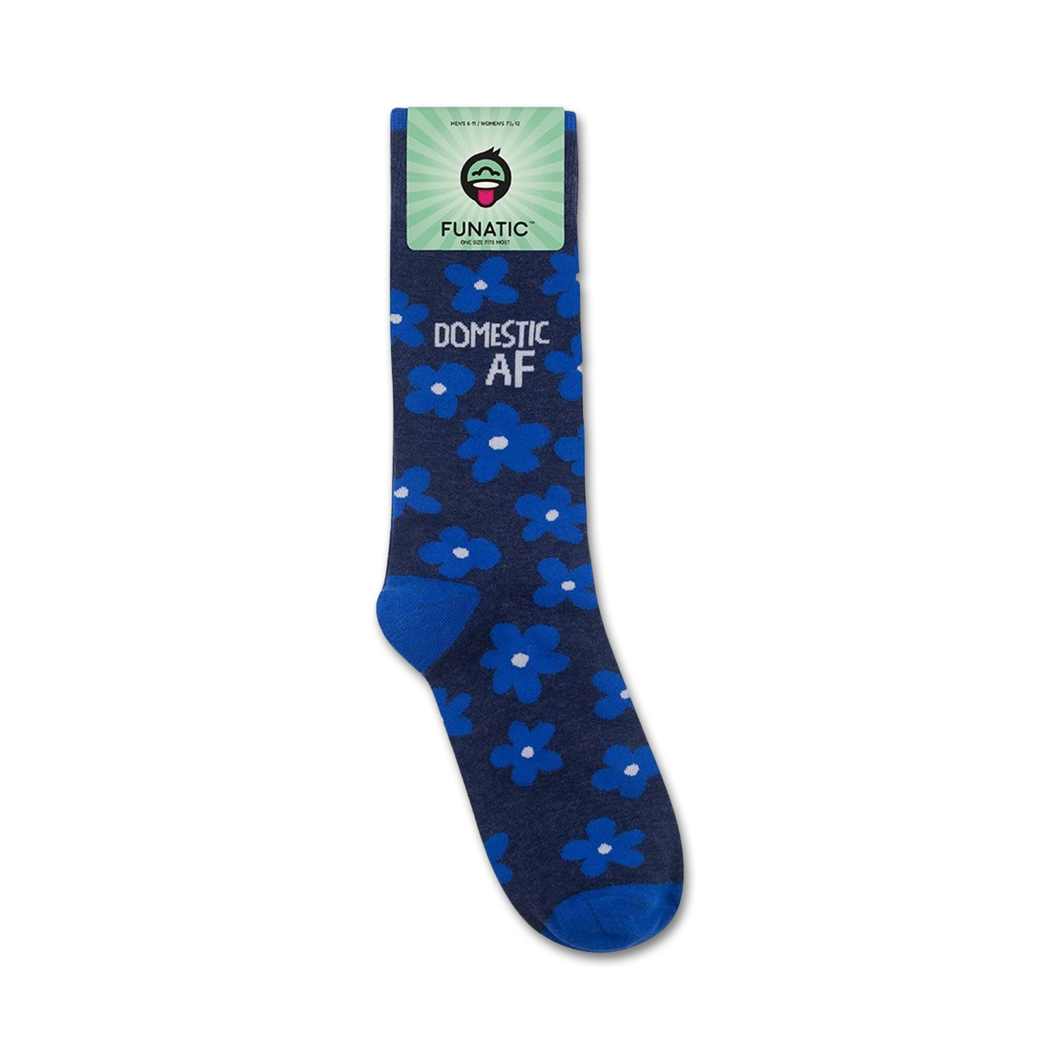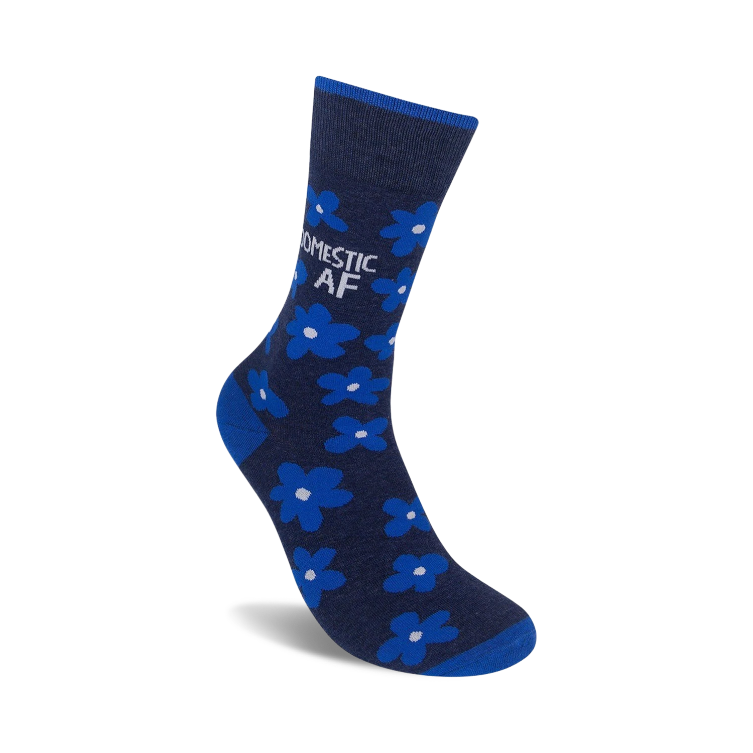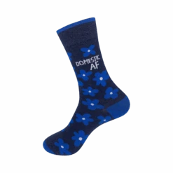 Domestic AF socks: The ultimate in sass and style. These crew socks feature a dark blue background with a pattern of light blue flowers with white centers. The words “Domestic AF” are displayed vertically on the leg of the sock in white. Whether you’re rocking them around the house or out on the town, these socks are sure to turn heads and make a statement. Show off your domestic prowess and let the world know that you’re the queen of clean sheets and a well-stocked pantry.