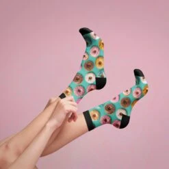 Donut lovers unite! Get your kicks with our new Donuts 360 socks, featuring a delectable pattern of assorted donuts on a vibrant blue background. Treat your feet to these tasty morsels and indulge in a sugar rush of fun and style. Whether you’re a glaze fanatic, a sprinkles enthusiast, or a jelly purist, these socks will have you walking on air. So go ahead, dunk your toes into the donut delightfulness, and let your feet take a bite out of fashion!