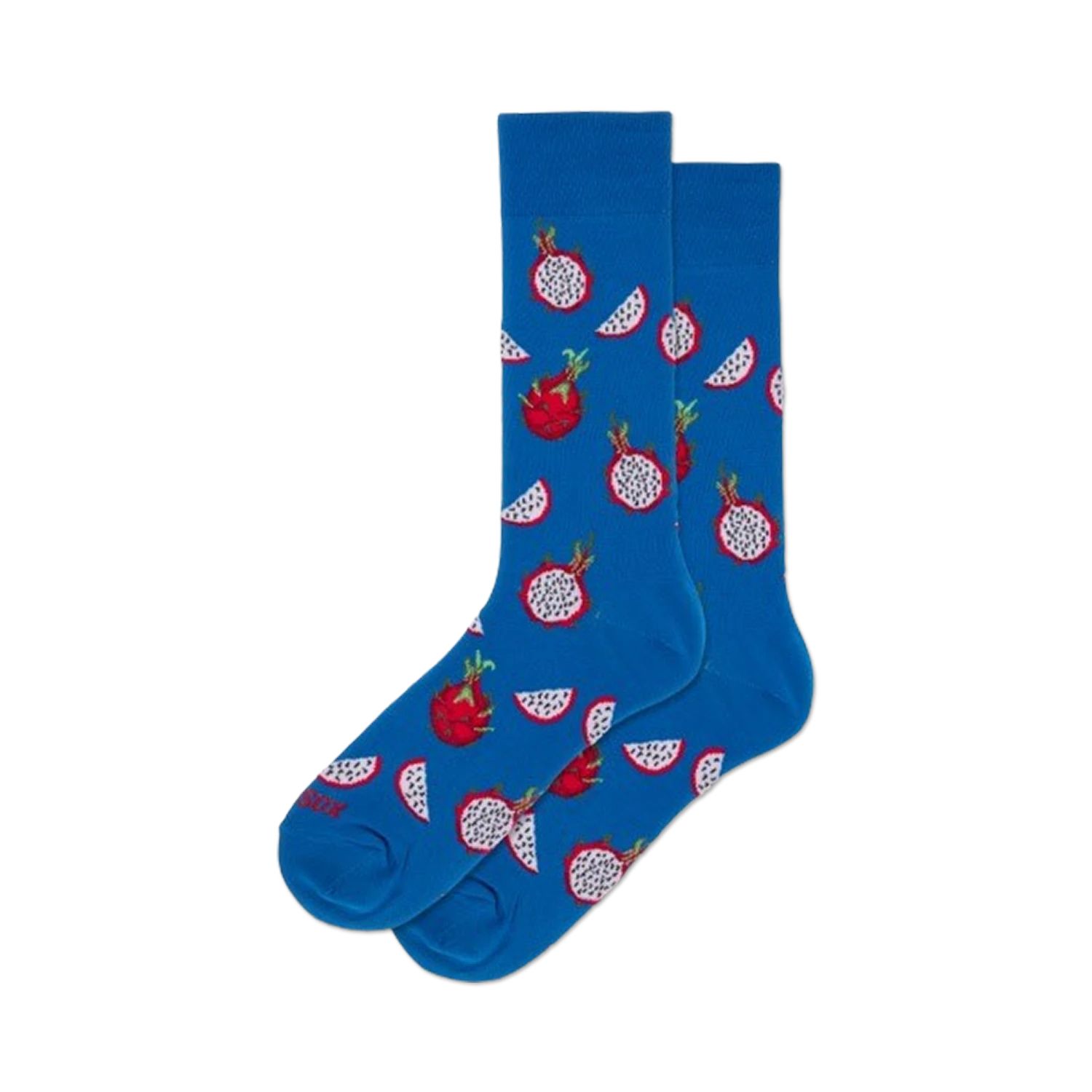 Put some pep in your step and show off your sweet tooth with these Dragon Fruit Socks! Featuring a bold pattern of juicy red dragon fruit against a vibrant blue background, these socks are sure to turn heads and make you the life of the party. Let everyone know that you’re as sweet as a dragon fruit and just as fun and energetic!