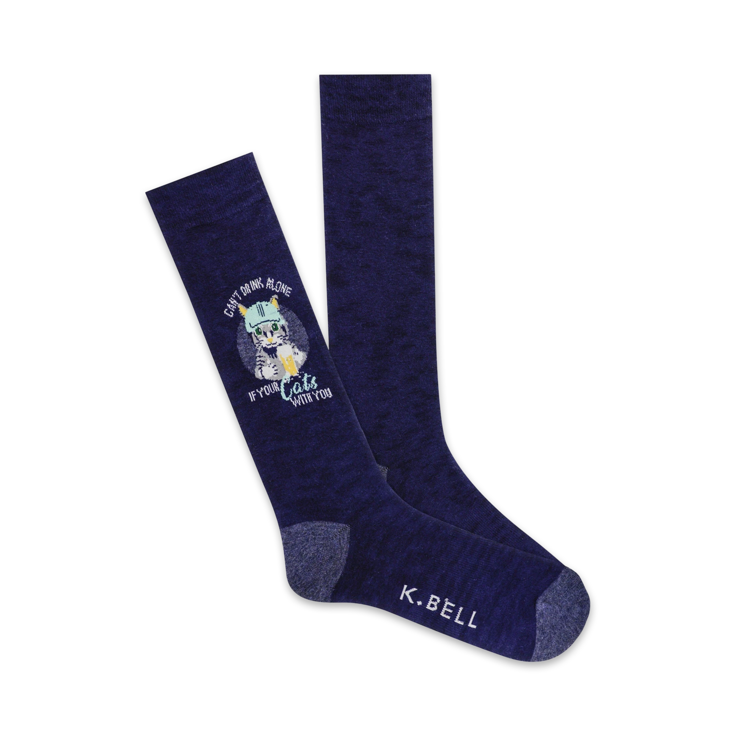 Raise a glass to your favorite drinking buddies while wearing these funny and boozy cat-themed socks! Featuring a picture of a cat wearing a hat and drinking from a glass, and the text “Can’t drink alone if your cat’s with you,” these crew socks are sure to get a laugh from your friends. Who needs a designated driver when you’ve got your cat with you? They may not be able to hold your hair after a night of fun, but they’ll never judge you for wanting that extra glass of wine.